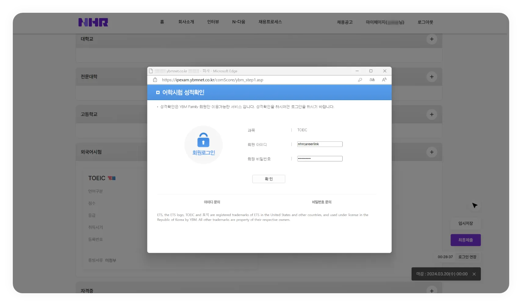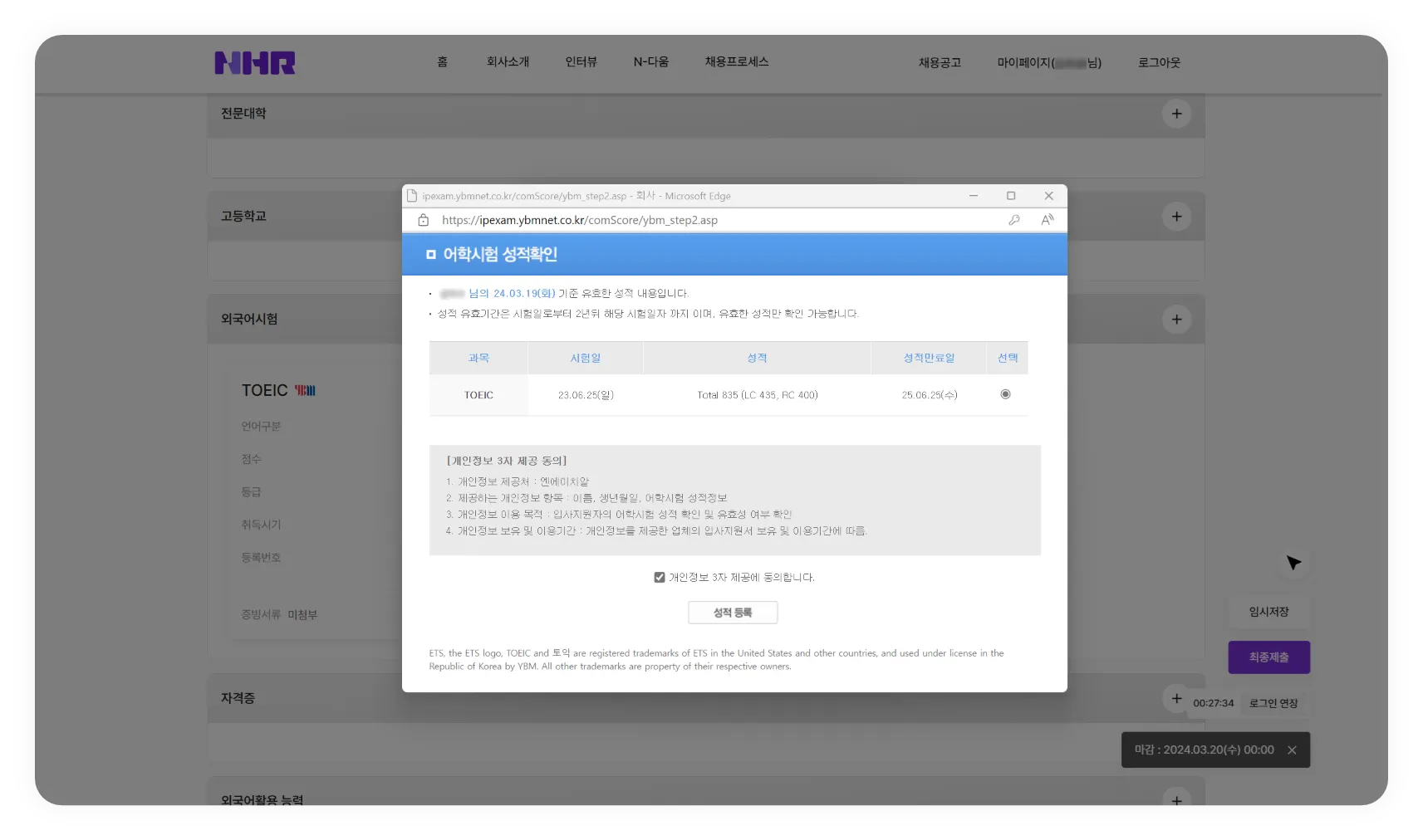 YBM 성적 자동확인 기능을 통해 채용 담당자는 별도의 진위 여부 확인 없이 지원자에 대한 어학 성적을 확인할 수 있으며, 지원자는 별도의 성적/취득일/등록번호 등을 확인해야하는 번거로움을 줄일 수 있습니다.