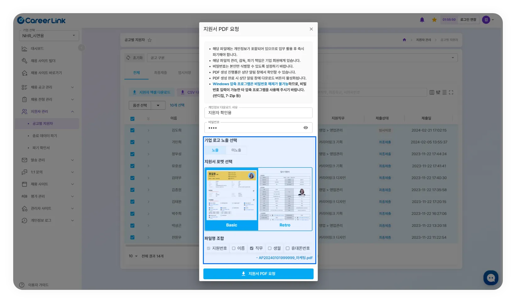 개인정보 다운로드 사유 / 비밀번호 / 기업 로고 노출 여부 / 지원서 포맷 / 파일명 조합을 선택하고 [지원서 PDF 요청]을 클릭합니다.