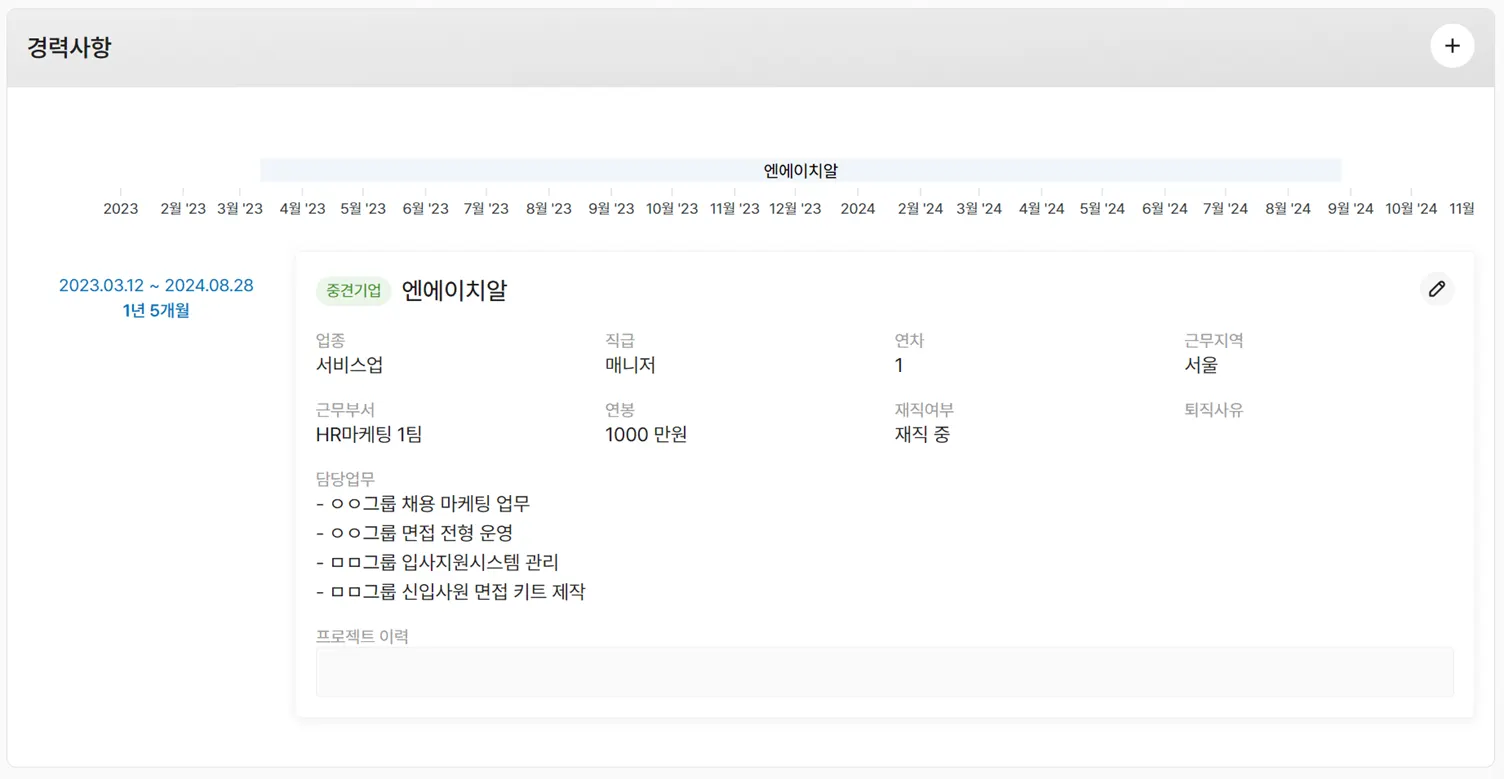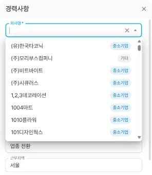 [경력사항] 입력 시, 기업 DB관리로 기업명을 지원자가 다르게 작성하는 문제를 개선했습니다.