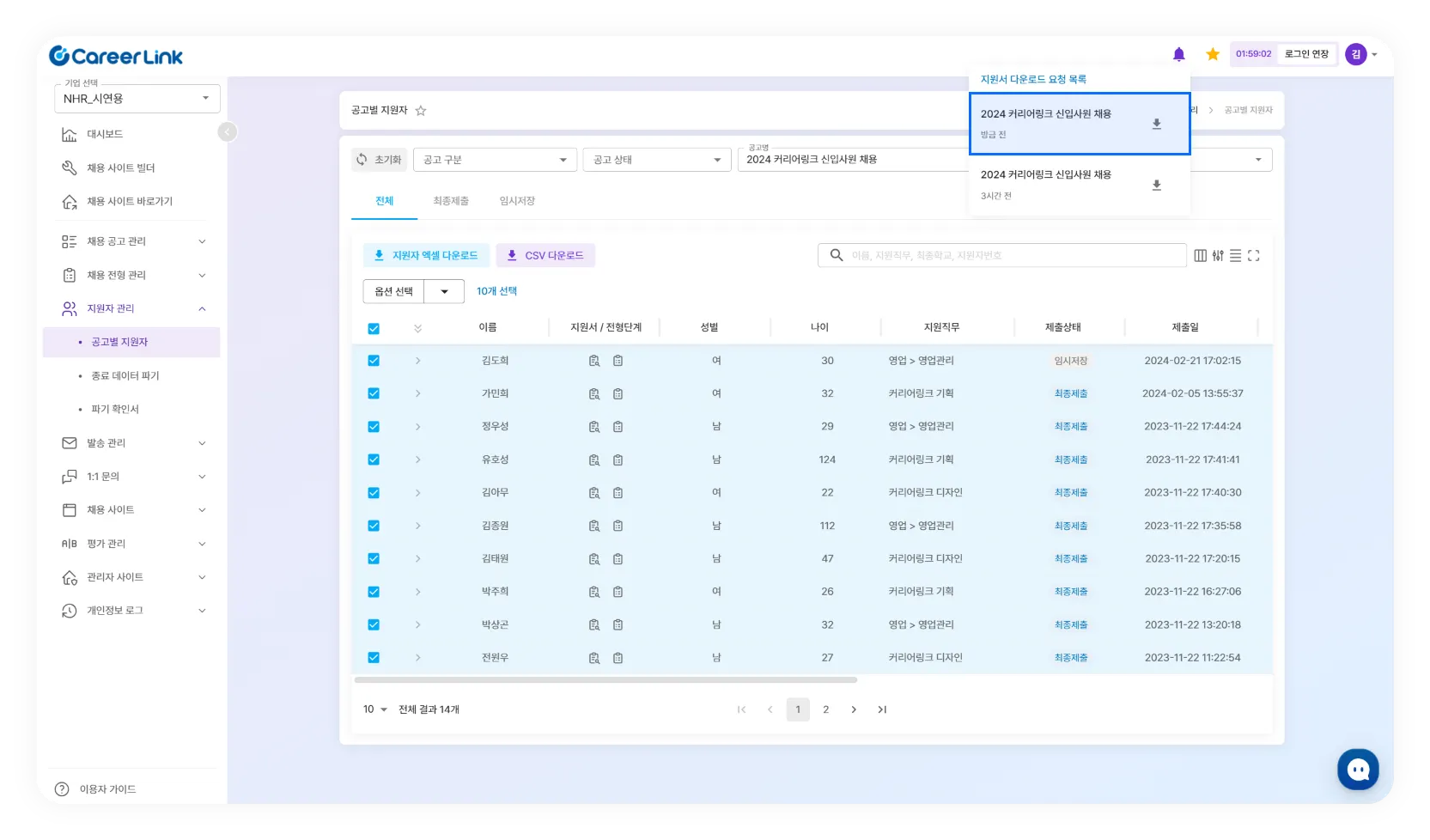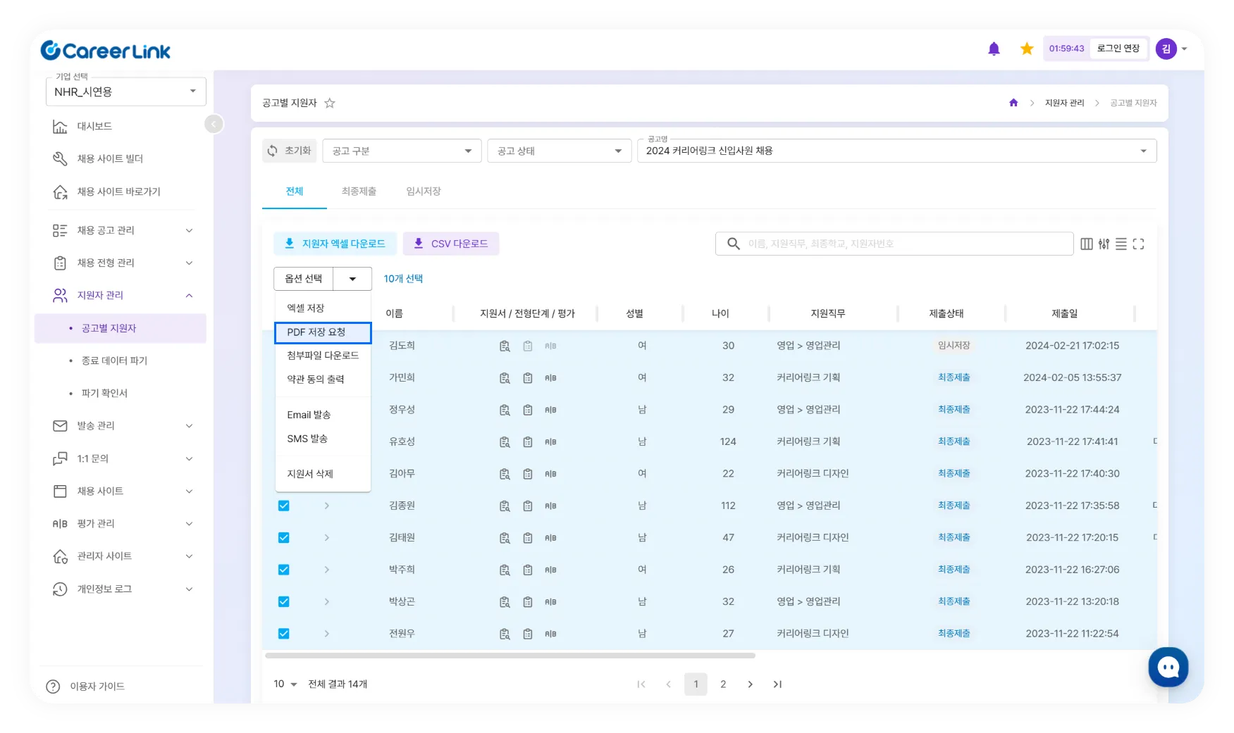 [지원자 관리] > [공고별 지원자]로 들어가 출력하고자 하는 지원서를 선택한 후, [PDF 저장 요청]을 선택합니다.