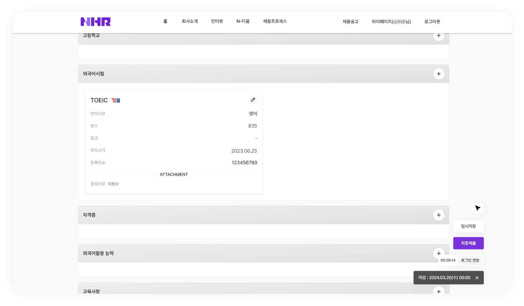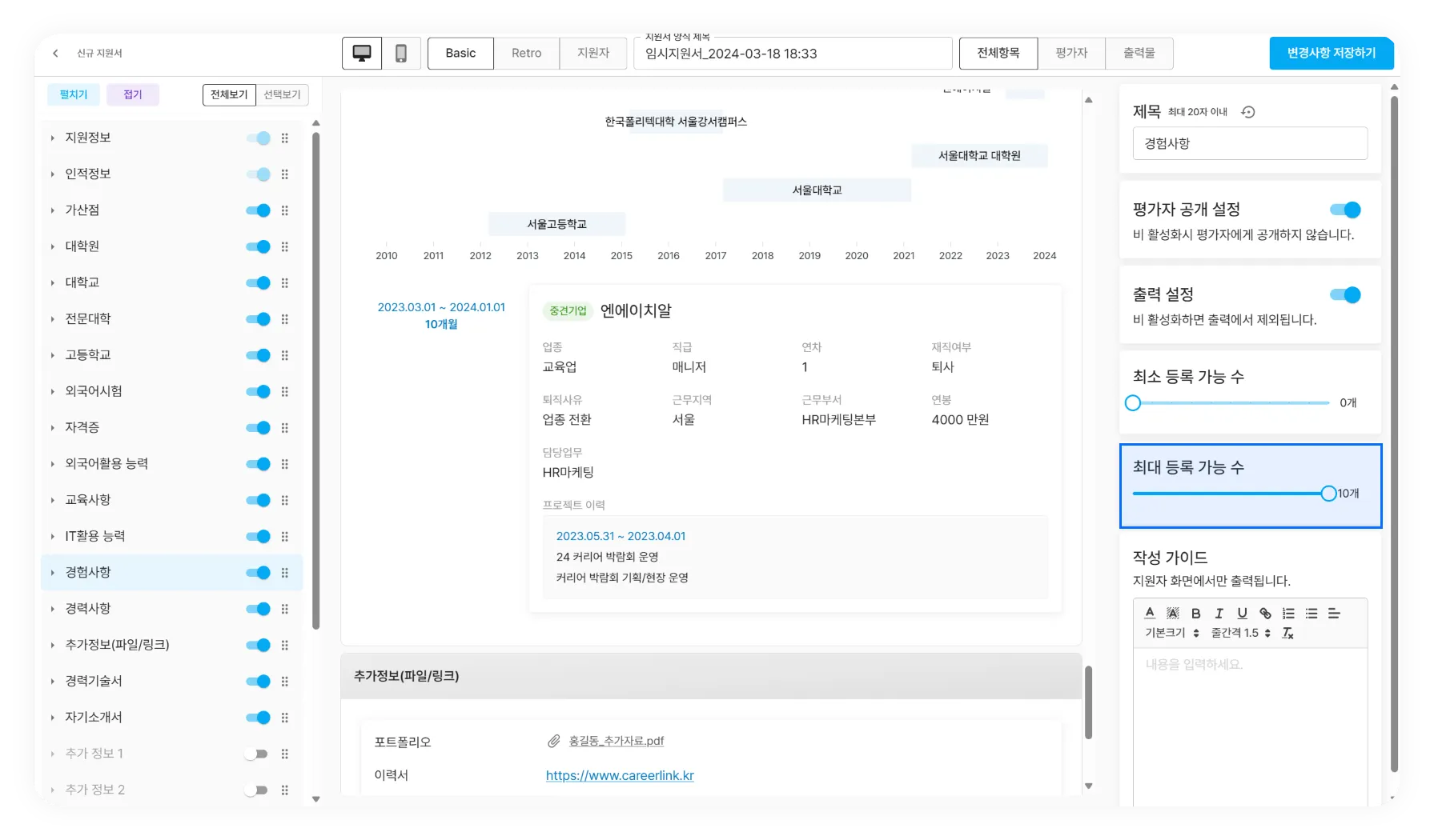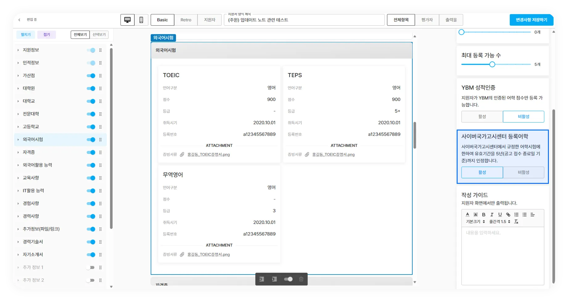 기존에 5개의 항목까지만 입력이 가능했던 [외국어시험], [자격증], [경험사항], [경력사항] 카드의 최대 등록 가능 수가 10개로 확대되었습니다.