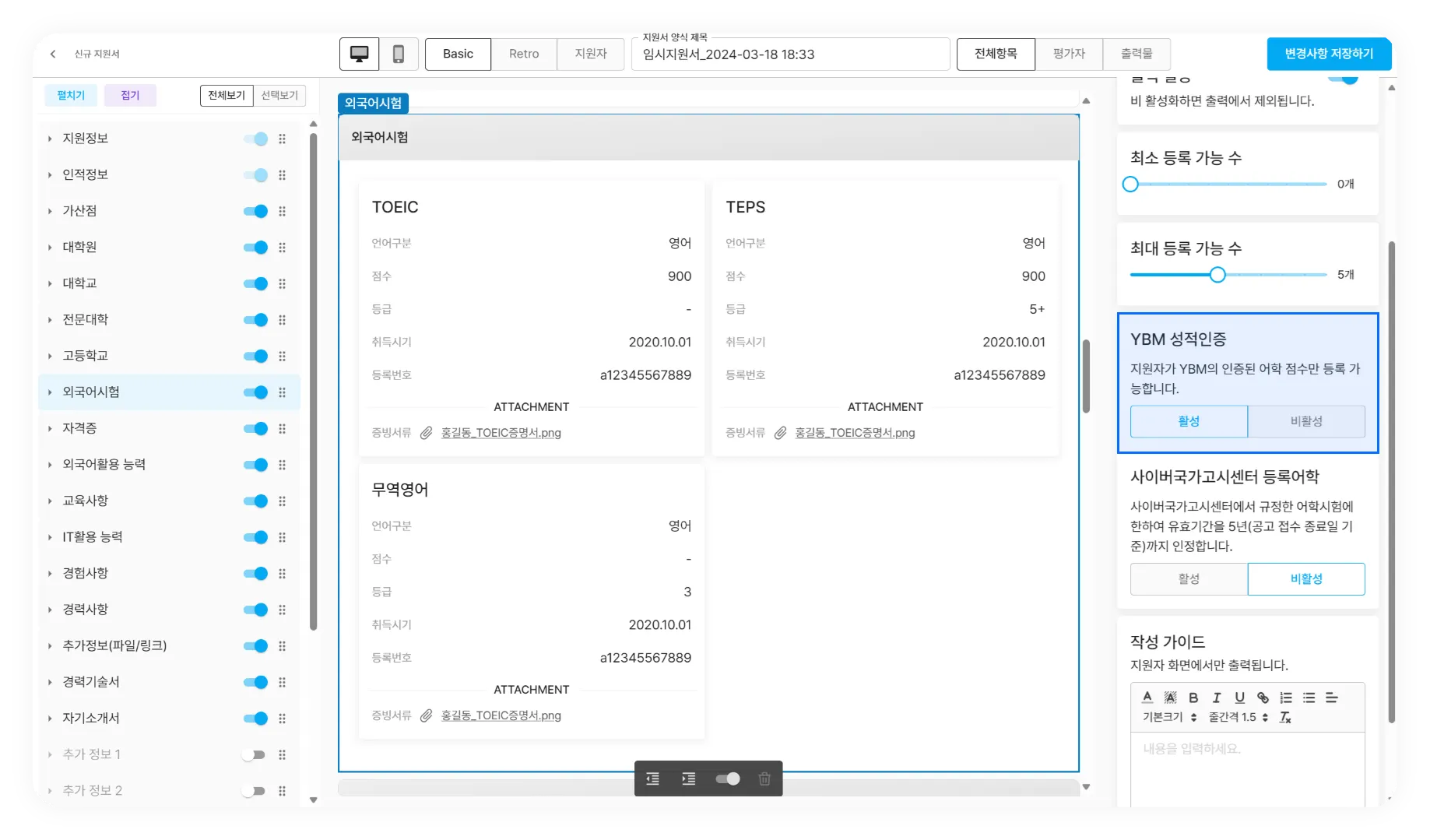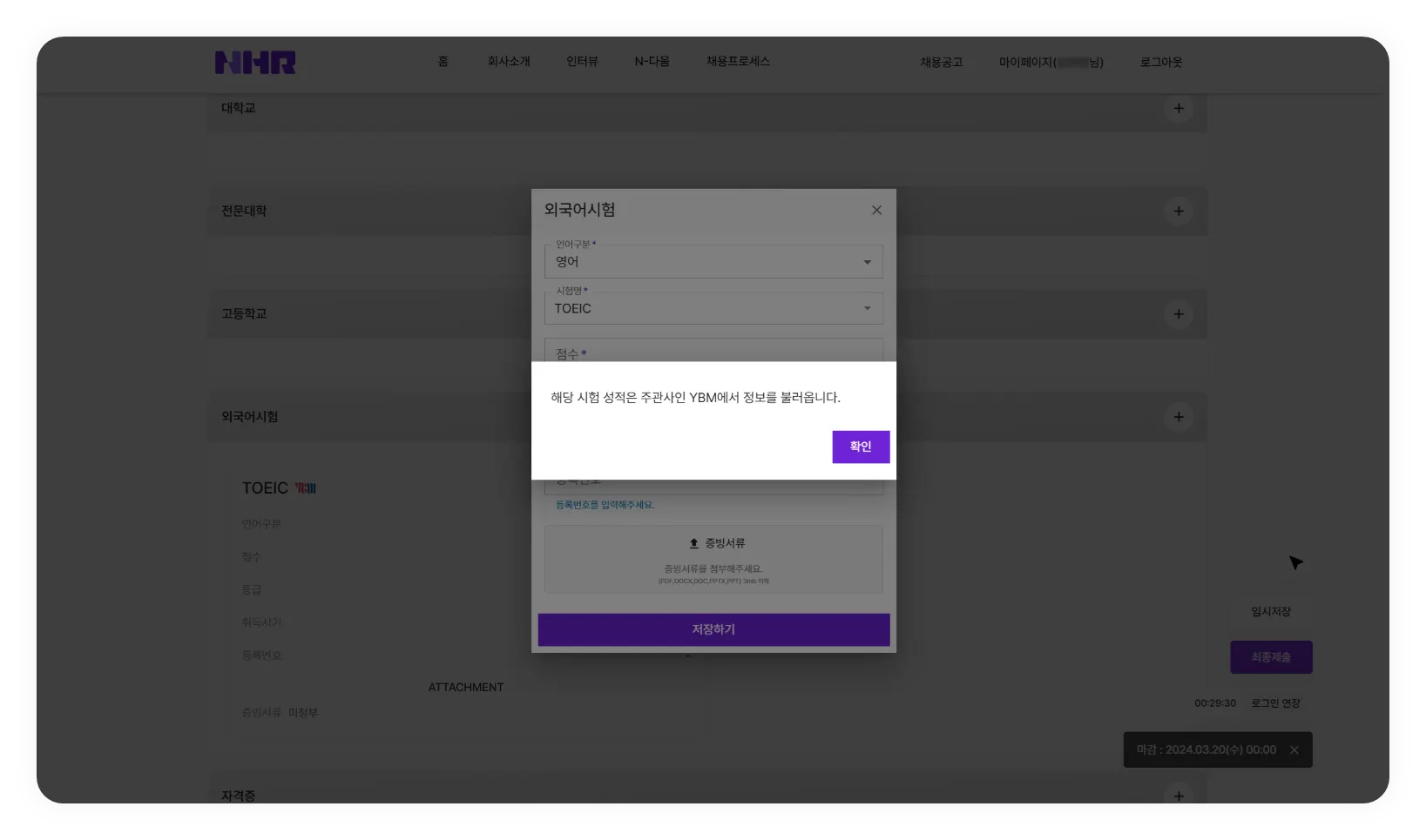 YBM과의 연동기능을 도입해 통해 특정 어학 자격증에 대한 인증절차를 도입했습니다.