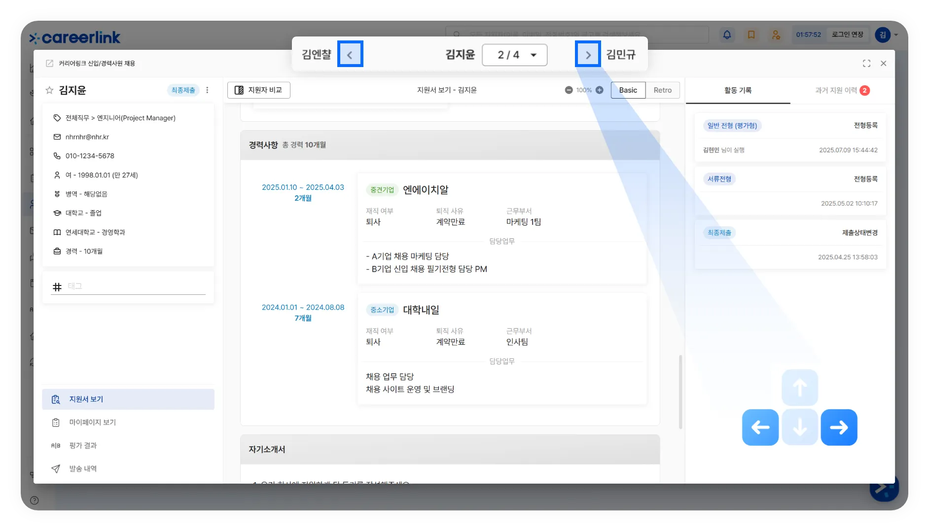 지원서 상세보기 화면에서 키보드 방향키로 지원서 넘기기 기능이 추가되었습니다. 이전/다음 지원서를 빠르게 넘겨볼 수 있습니다.