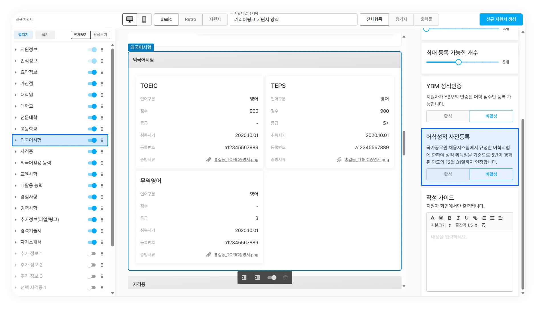 어학성적 사전등록 명칭 변경