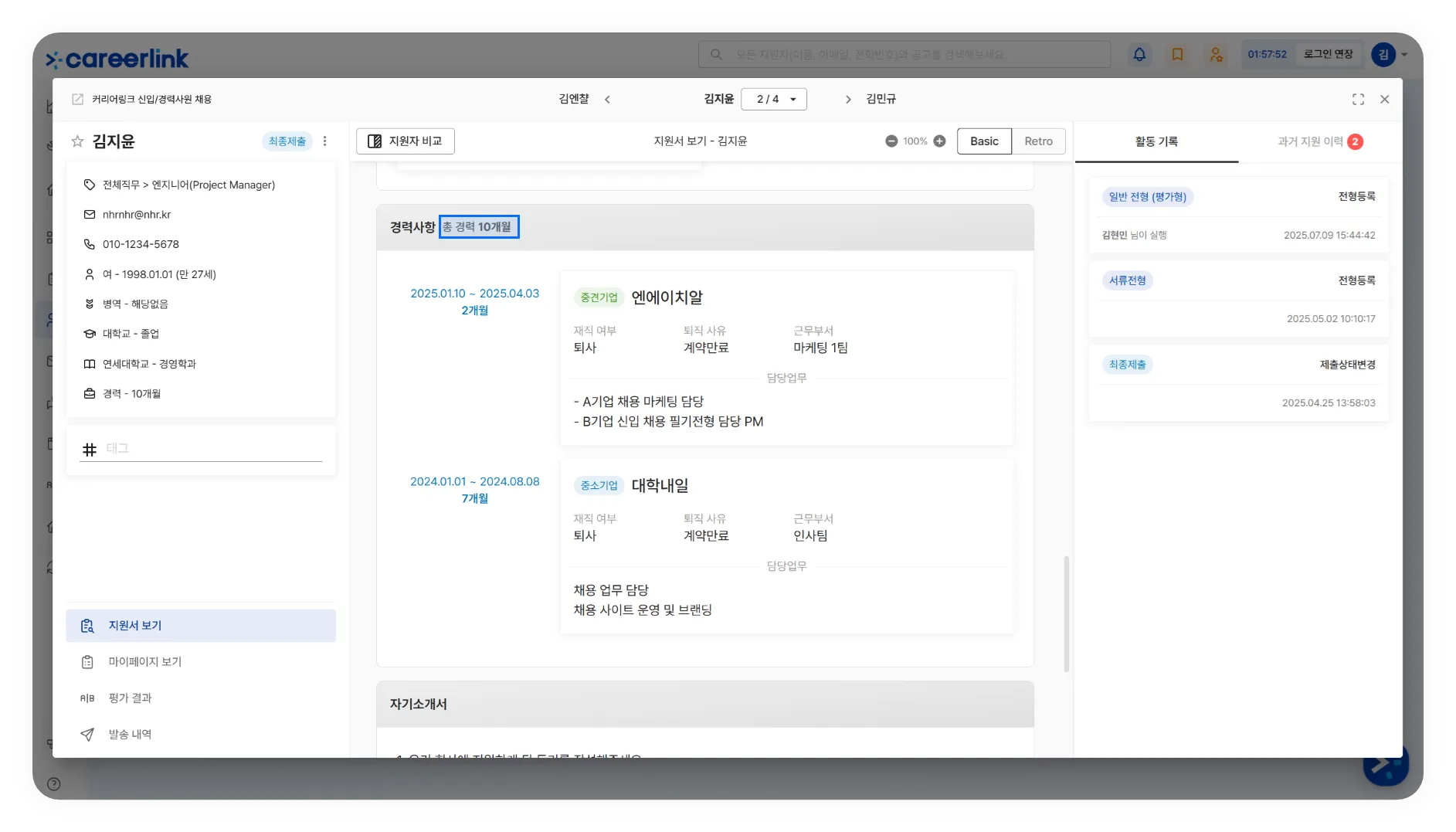 지원자가 작성한 경력사항 카드의 총 경력일이 나오며, 자동평가 시에도 반영되어 편리하게 재직 기간에 따라 지원자를 구분할 수 있습니다.