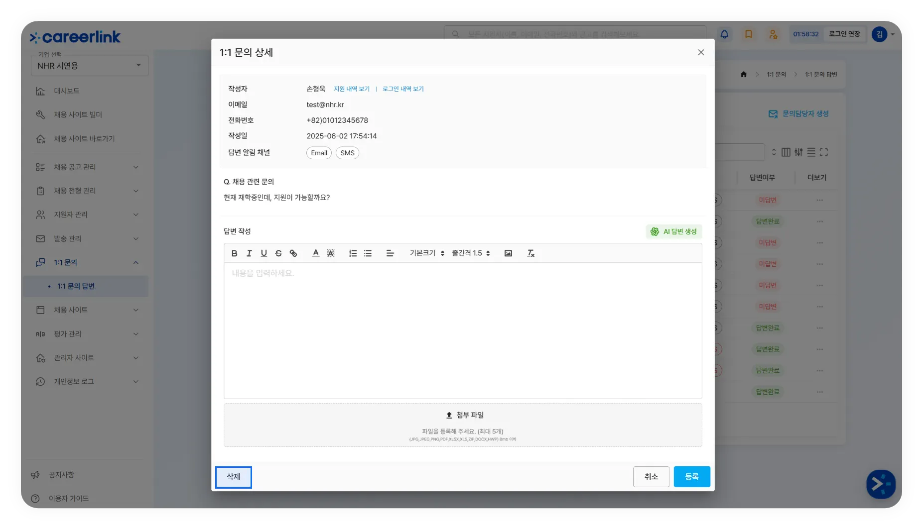 지원자가 남긴 1:1 문의 삭제가 가능합니다. (1:1문의를 삭제해도 지원자에게 노출되지 않습니다.)