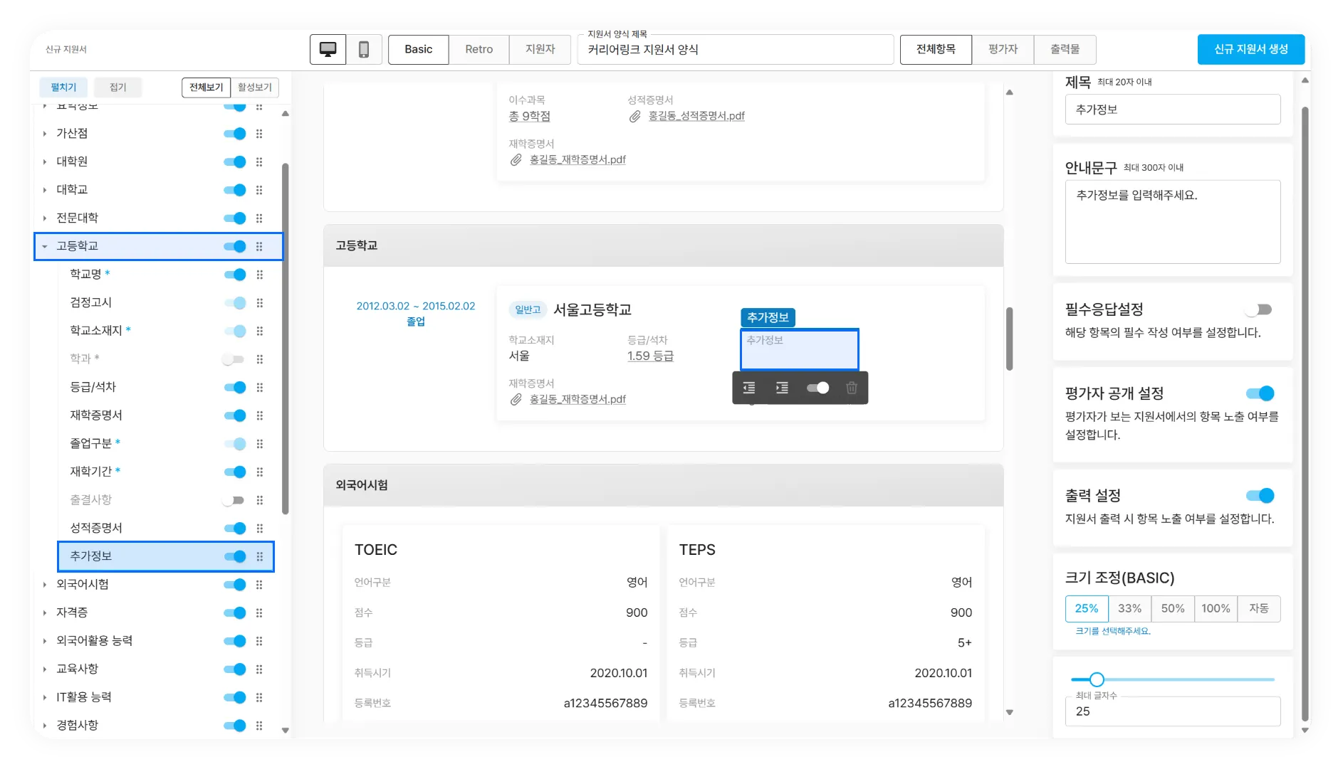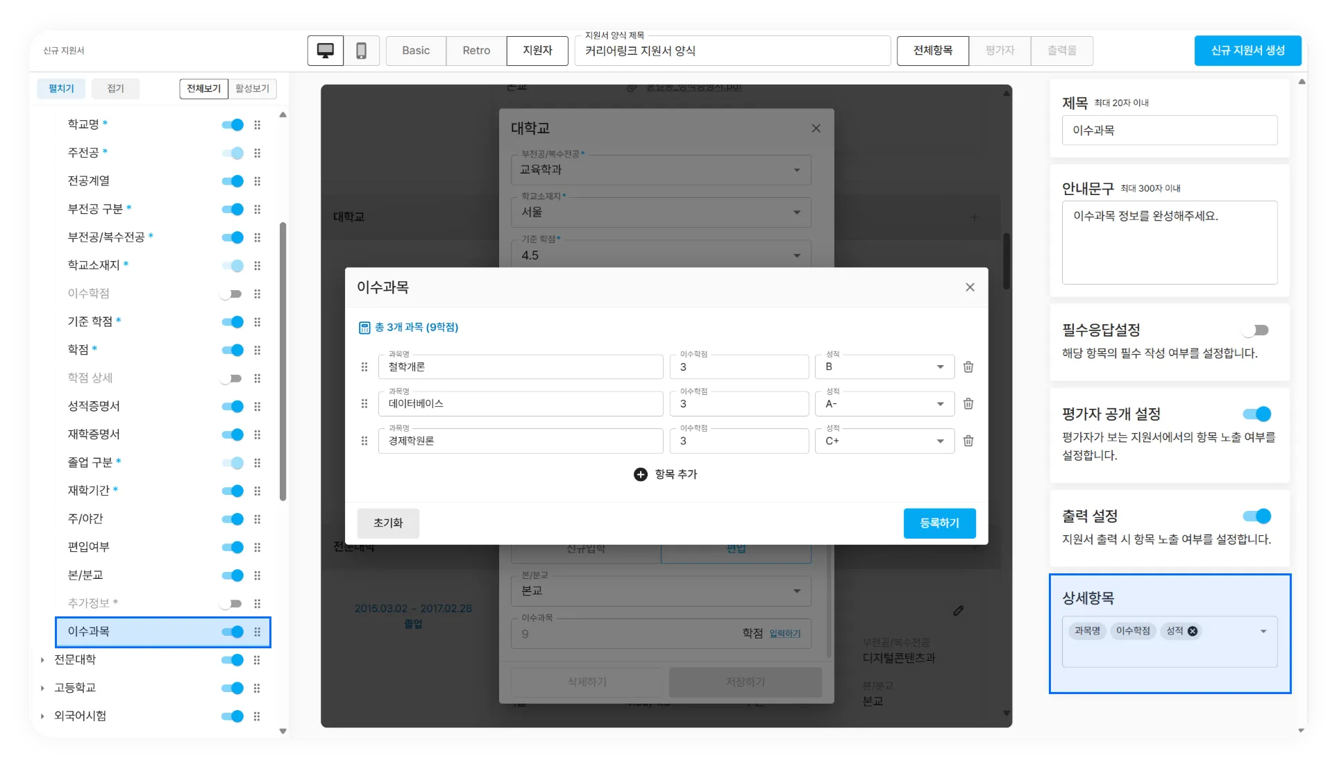 지원자는 본인이 수강했던 과목들을 직접 등록할 수 있으며, 관리자는 아래의 항목을 수집할 수 있습니다.
