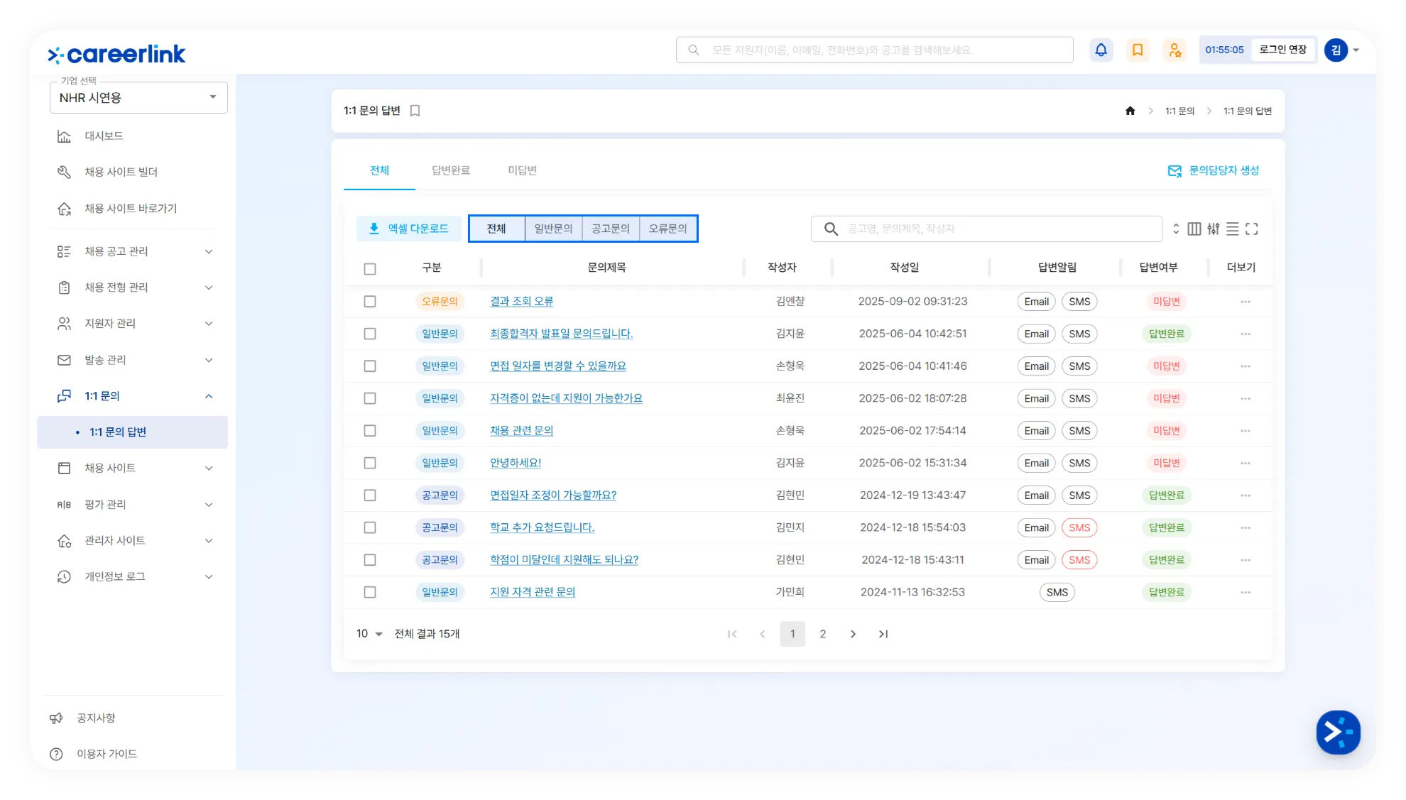관리자(인사담당자) 또한 ‘오류문의’ 에서 회원이 등록한 오류 문의를 확인할 수 있습니다.