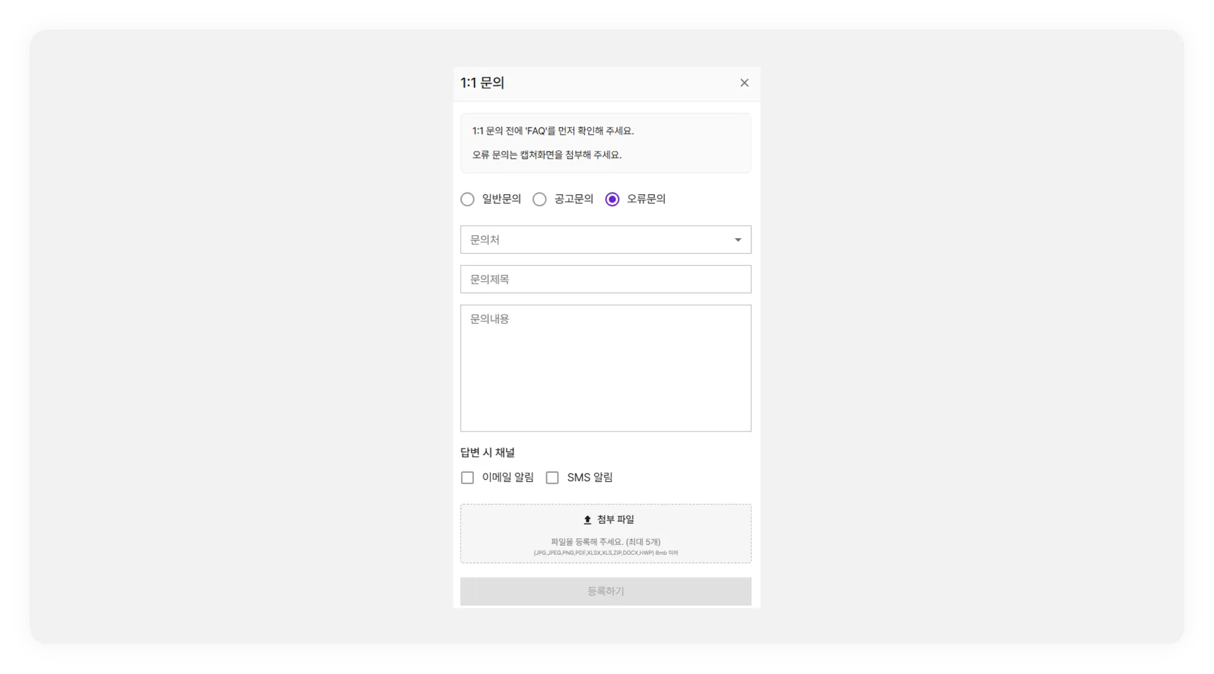 [오류문의] 항목이 새롭게 추가되어, 시스템과 관련된 오류는 [오류문의]에 작성이 가능합니다.
