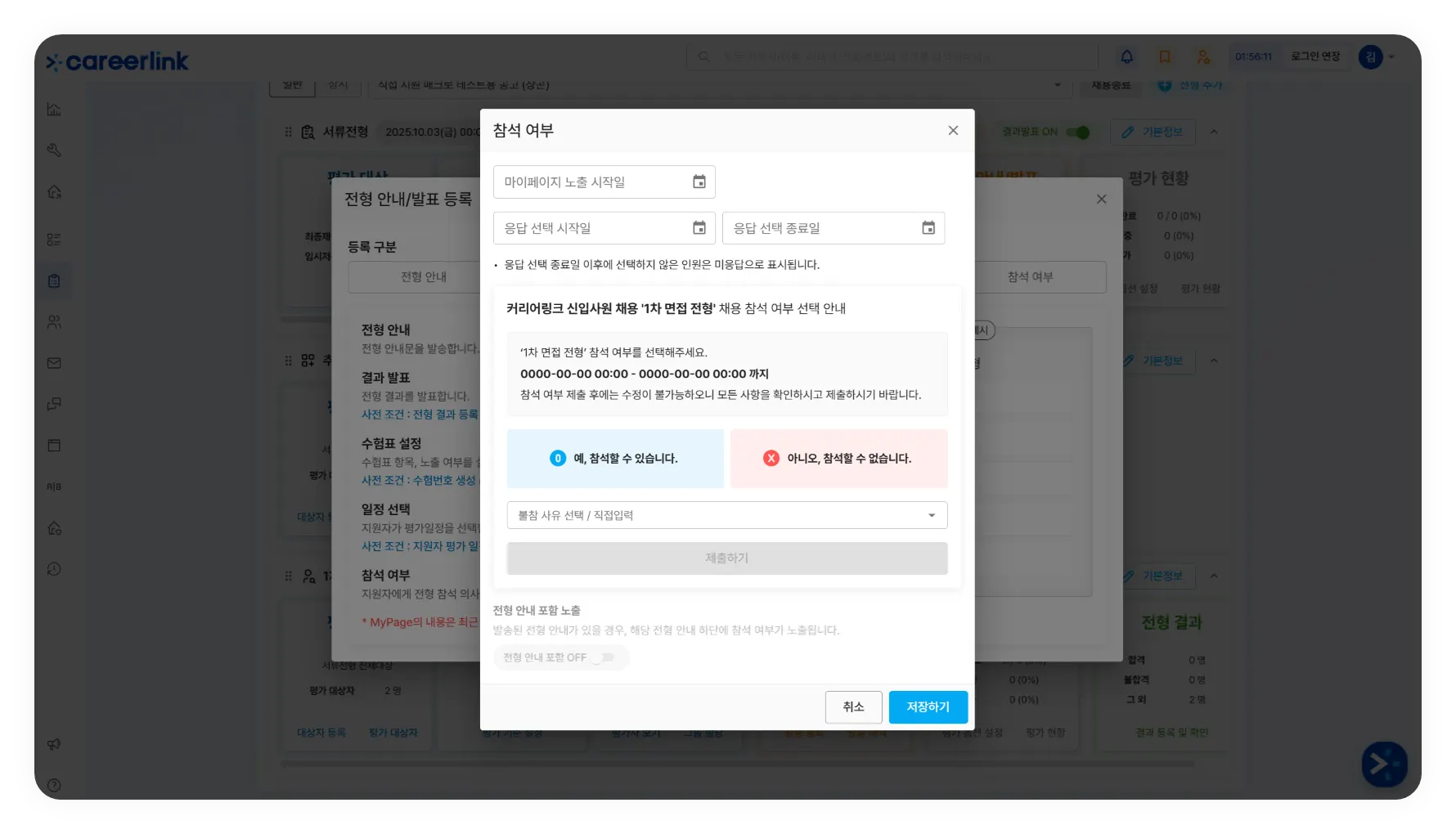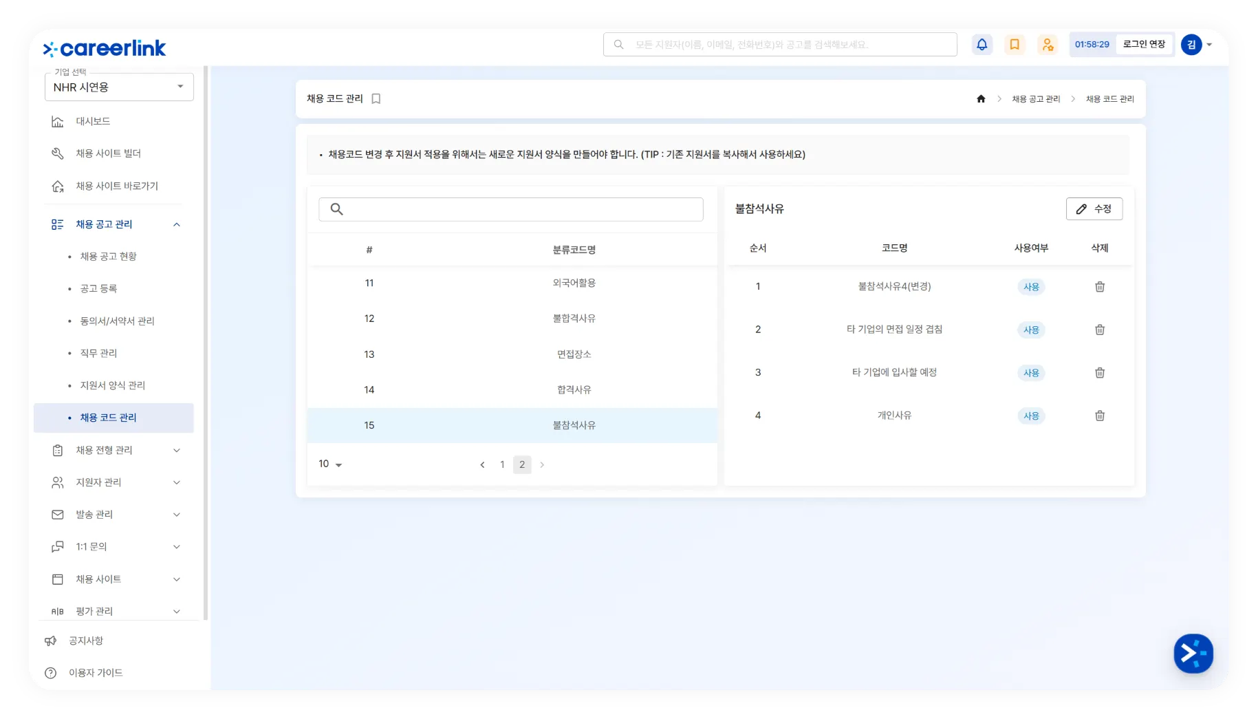 불참 사유에 사용되는 상세 항목은 [채용 공고 관리] → [채용 코드 관리]의 ‘불참석사유’에서 코드로 관리할 수 있습니다.