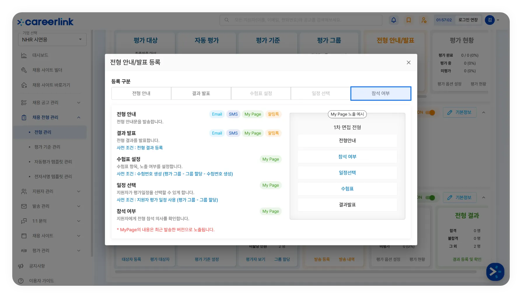 [채용 전형 관리] → [전형 관리]에 접속하여 희망하는 공고의 전형에 있는 ‘발송등록’을 클릭합니다.