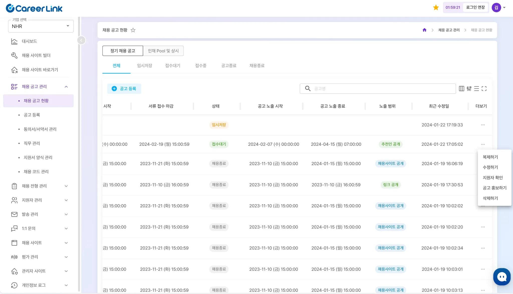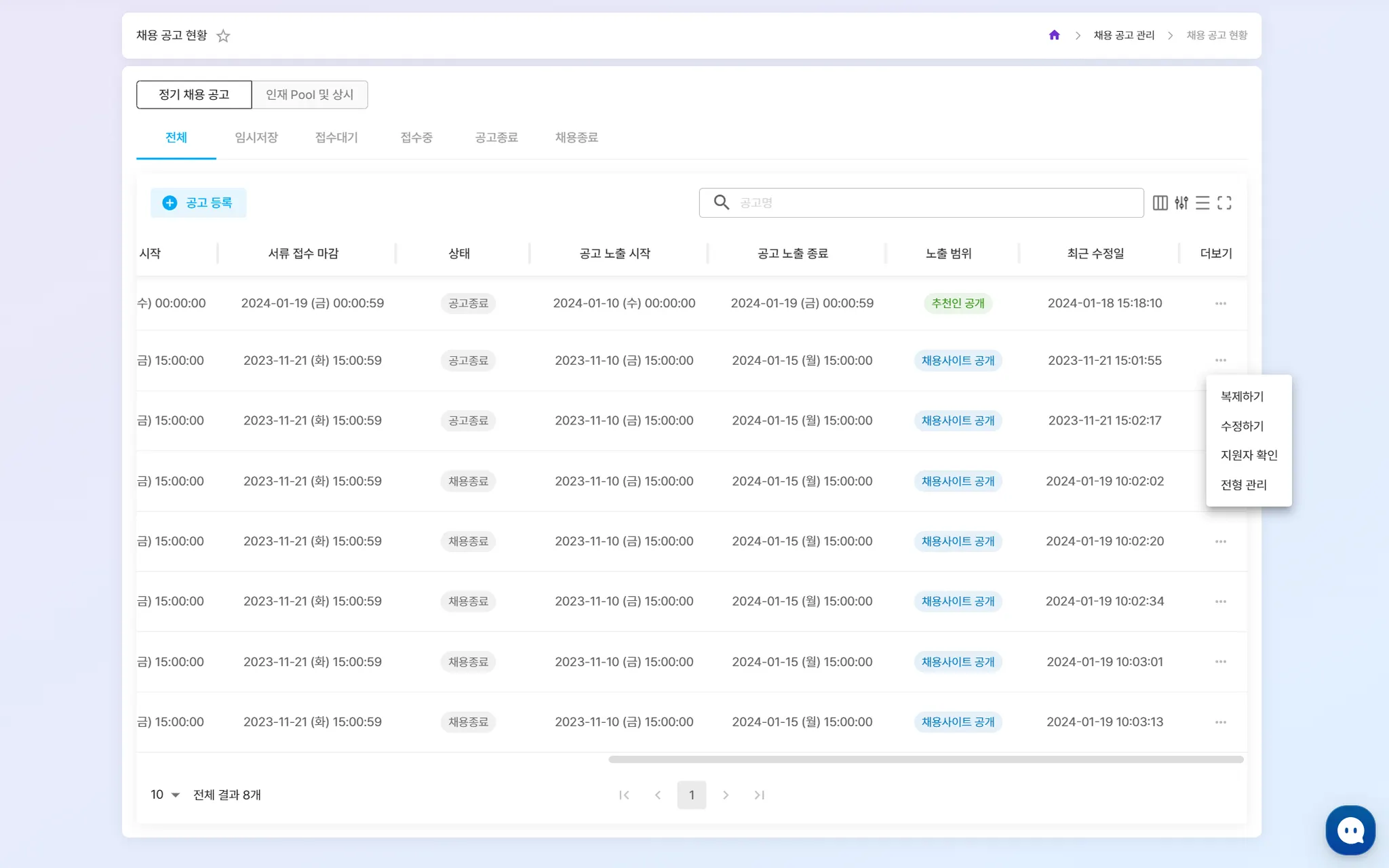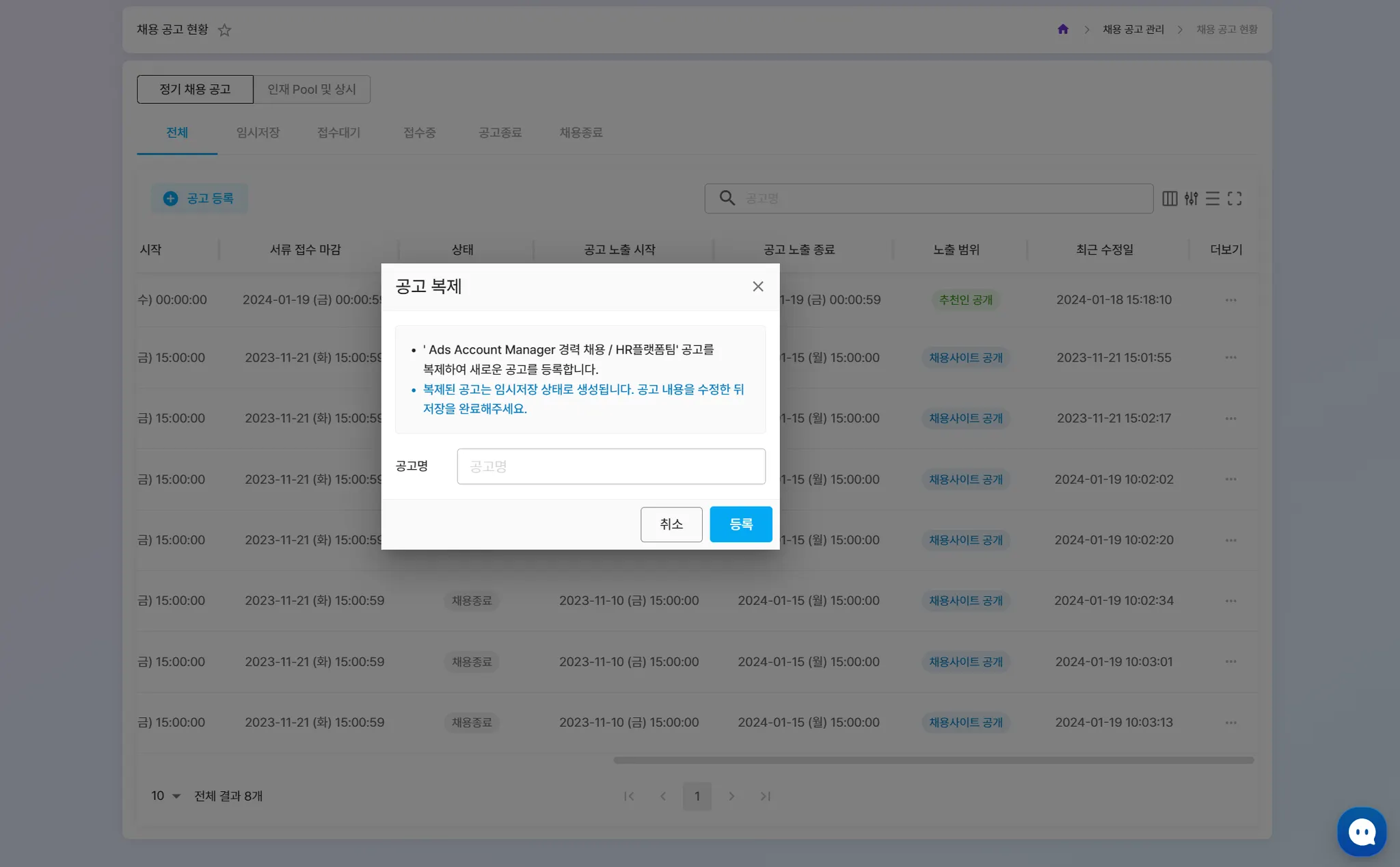 비슷한 채용공고를 진행하실 경우 ‘공고 복제 기능’을 통해 손 쉽게 공고를 생성할 수 있습니다.