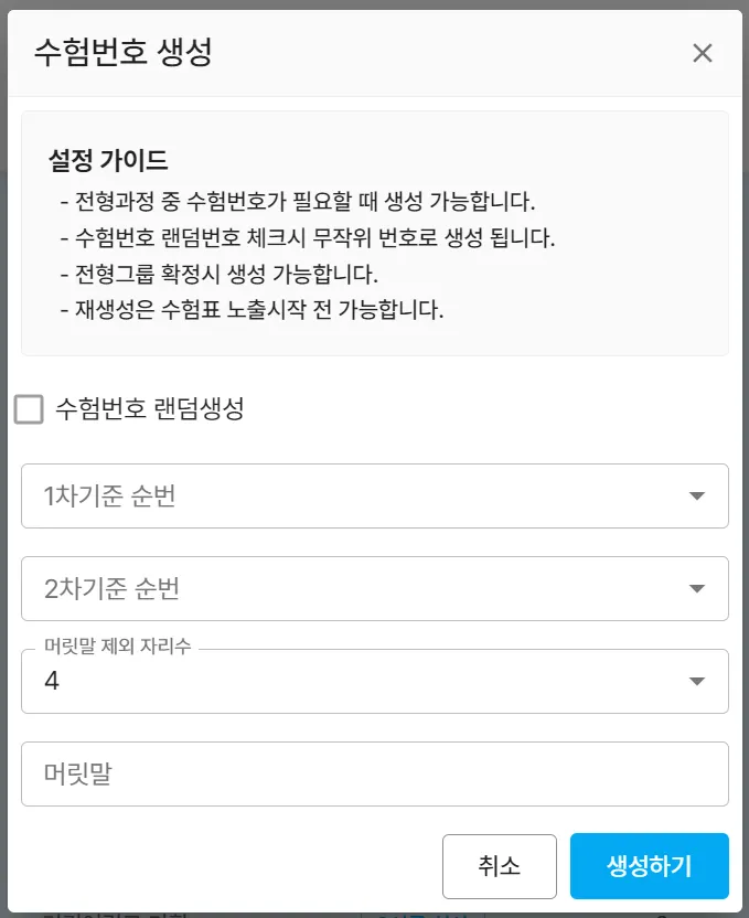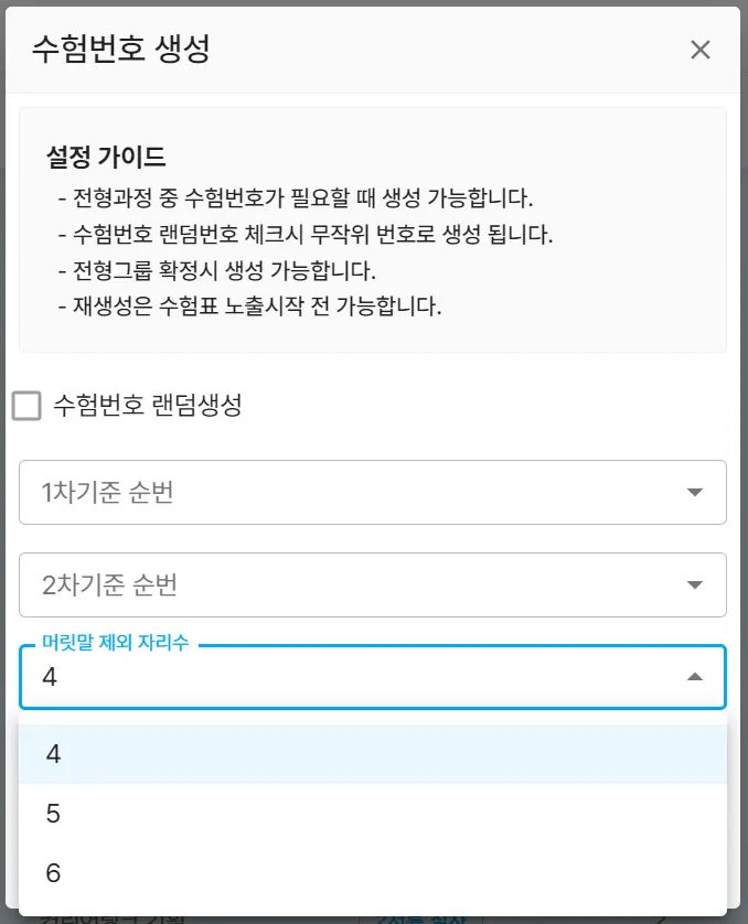 원하는 자릿수에 맞는 수험번호 생성이 가능해졌습니다.