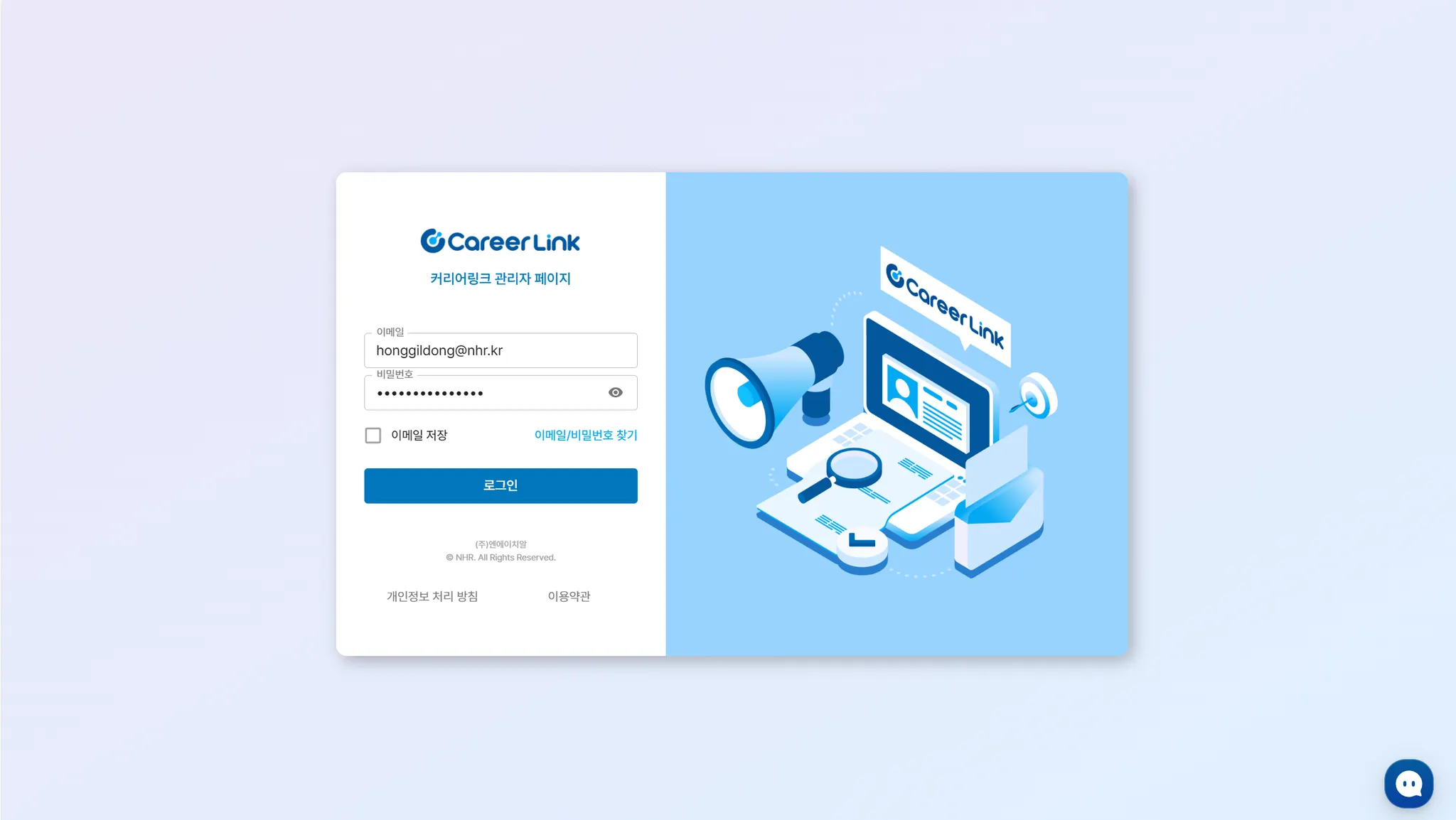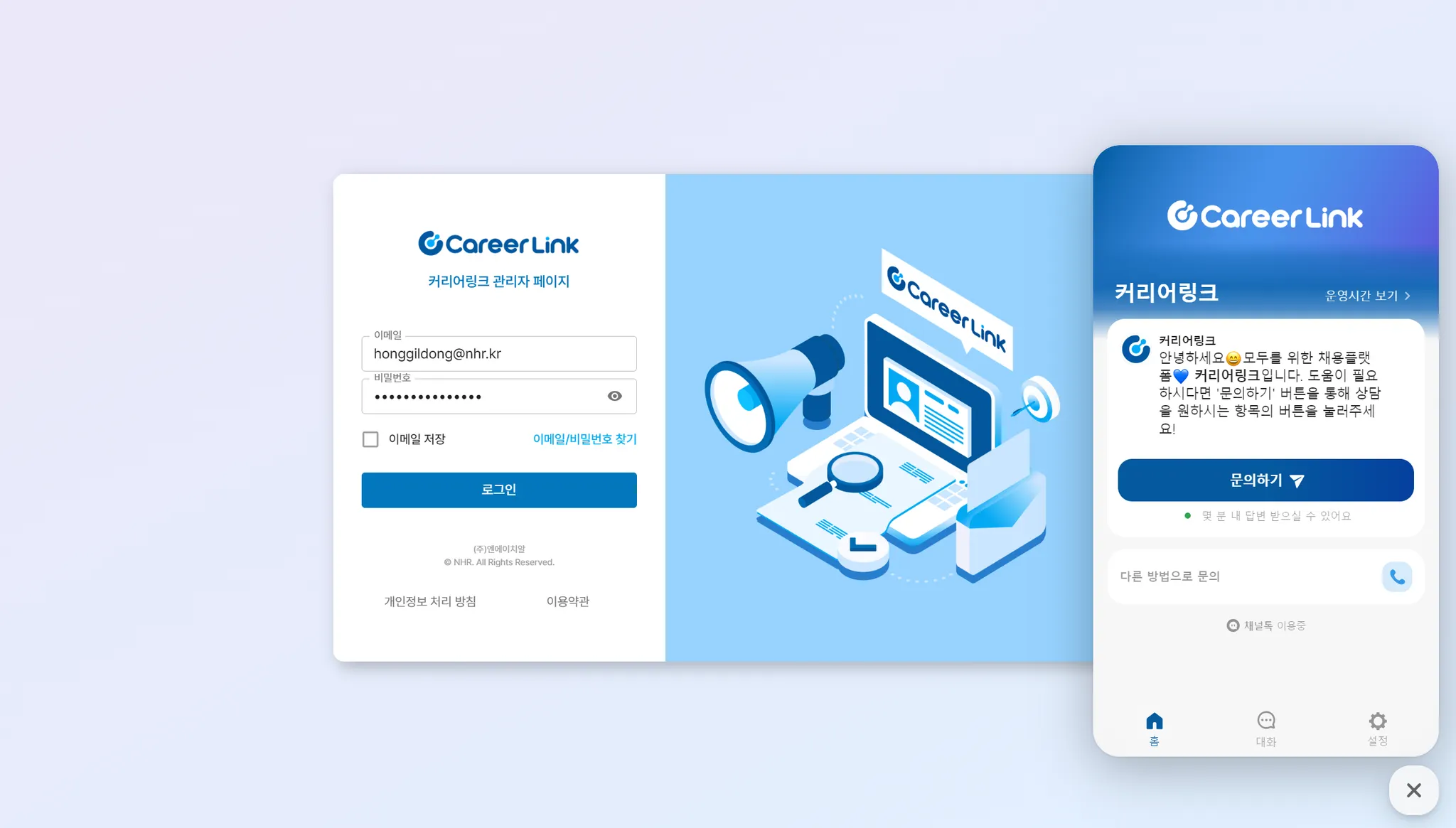 관리자 페이지 우측 하단에 채널톡을 추가하여 인사담당자와의 1:1 소통 및 즉각적인 대응이 가능해졌습니다. 가이드에서 찾기 힘든 궁금증 등이 있을 경우 또는 즉시 해결해야 하는 상황이 생겼을 경우 채널톡으로 문의 해주세요!