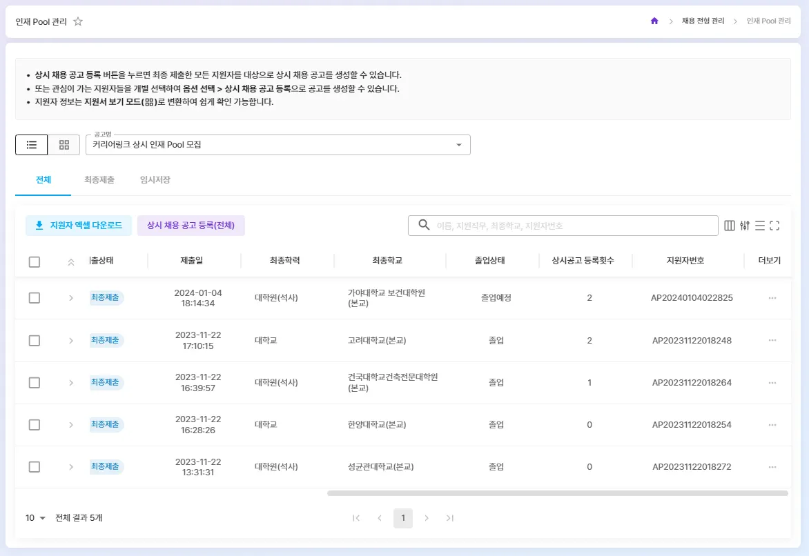 인재 Pool의 상시 공고에 지원자가 몇 번 등록했는지 확인이 가능합니다.