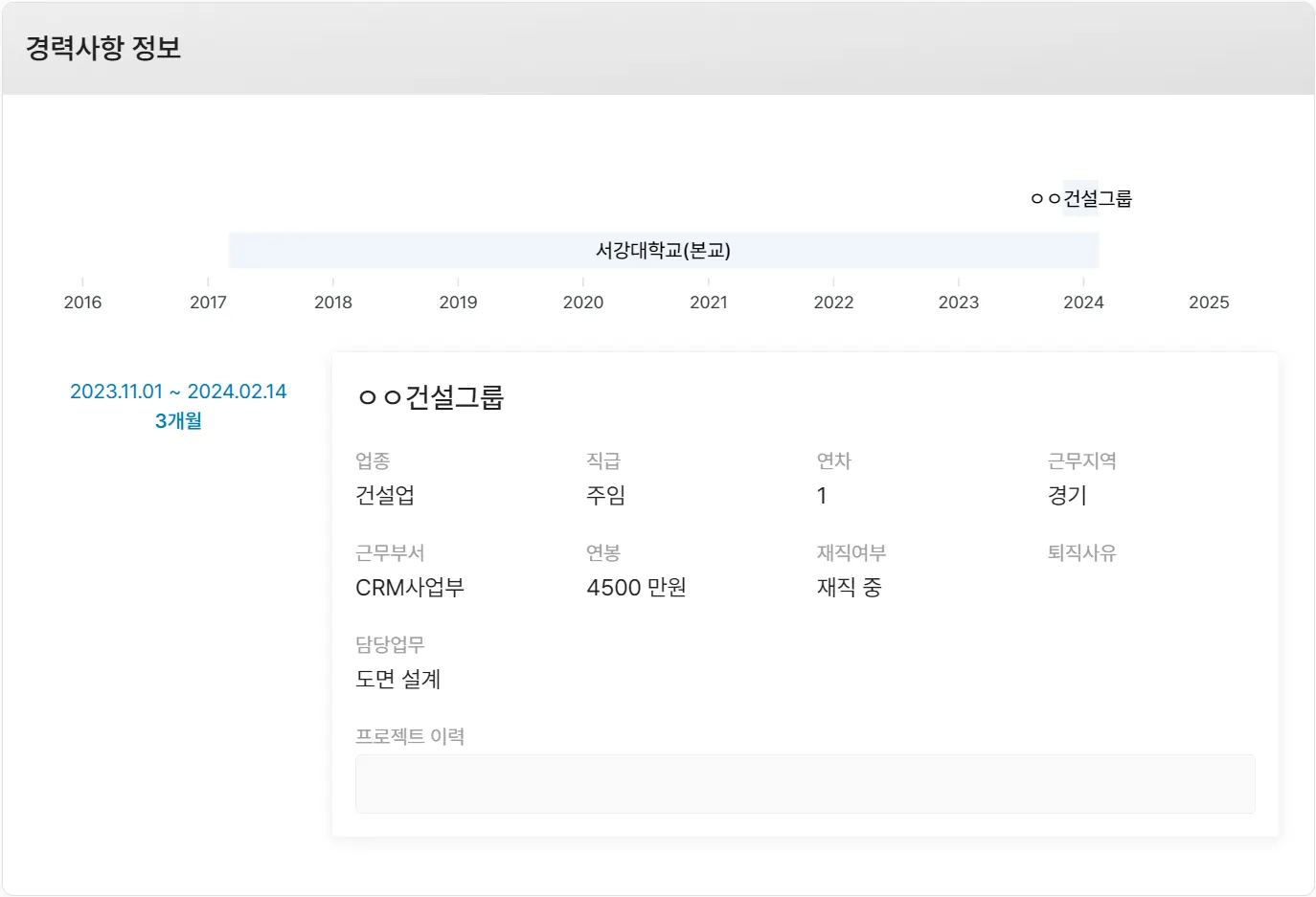 기존에는 경력사항에 근무기간을 입력했을 경우, 기간만 나와 지원자가 기업(기관)에서 얼마나 근무했는지 한번에 보기가 어려웠었는데요.