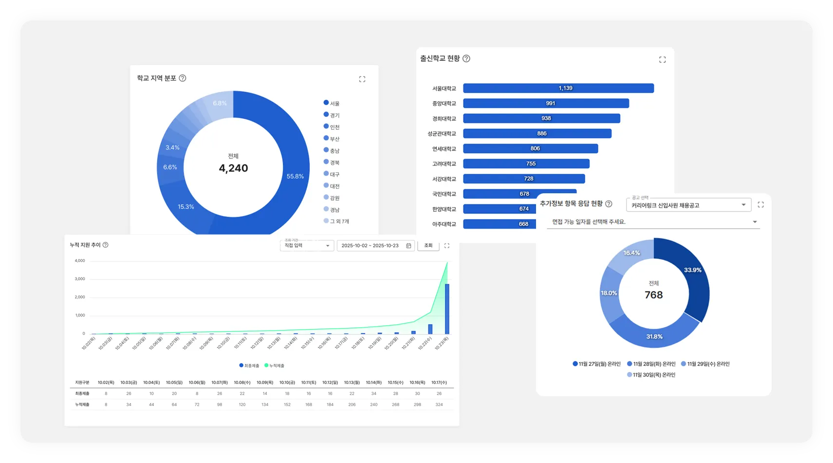 커리어링크의 채용 대시보드가 더욱 더 직관적으로 바뀌고, 다음과 같은 세부 통계 확인 기능이 추가되었습니다. 원하는 차트만 골라서 편집도 가능하며, 희망하는 데이터를 선택해 데이터 엑셀을 다운로드 받을 수 있습니다. 업데이트 된 대시보드를 통해 쉽게 지원자 현황과 채용 현황, 성과를 파악할 수 있습니다.