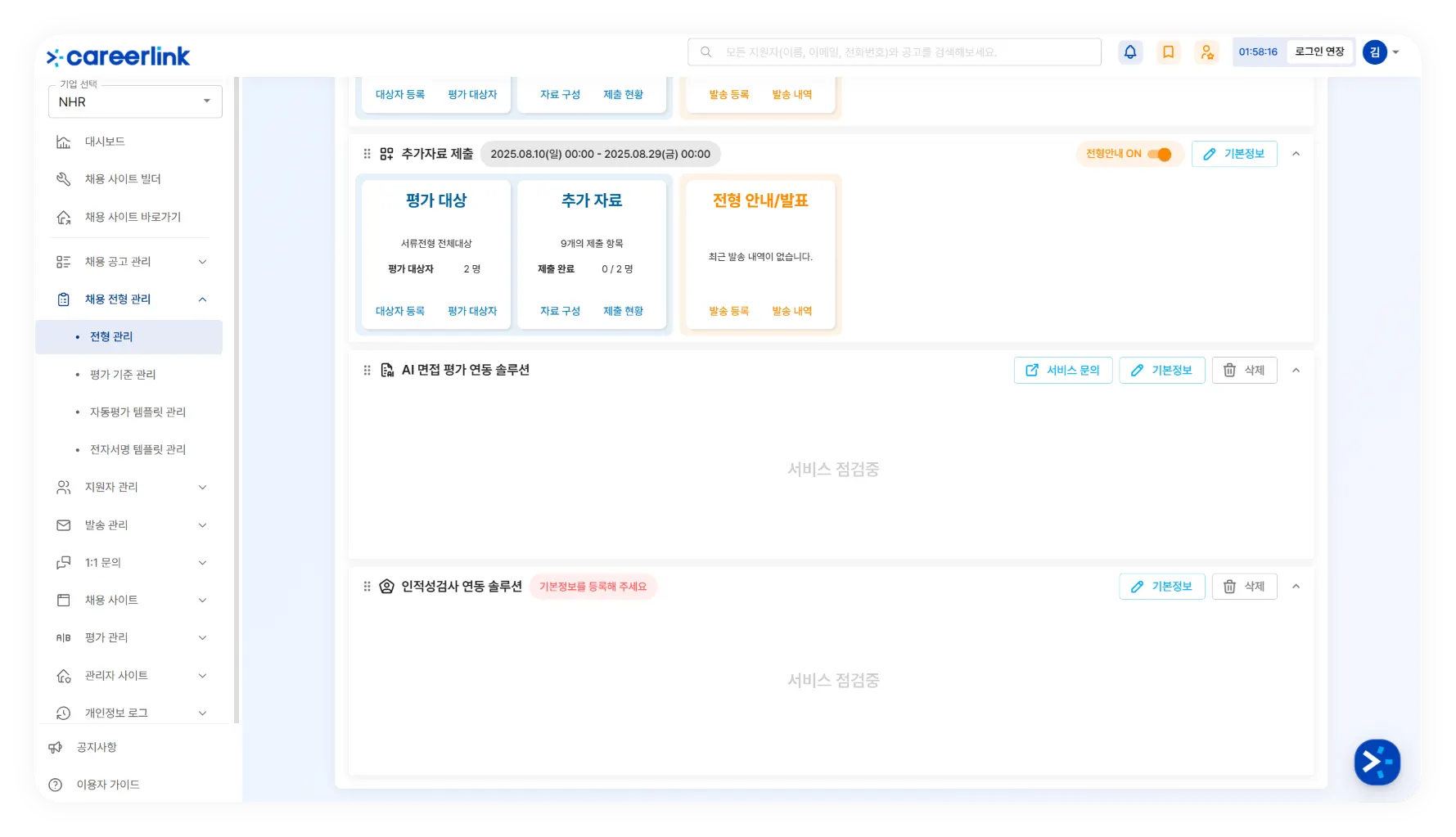 외부 연동 솔루션(AI 서류 평가, AI 면접 평가, 지원자 평판 조회, 인적성 검사 솔루션 등)의 서비스에 오류가 발생하더라도 커리어링크와 외부 연동 솔루션을 분리시켜, 커리어링크의 서비스는 정상적으로 이용하실 수 있도록 개선되었습니다.
