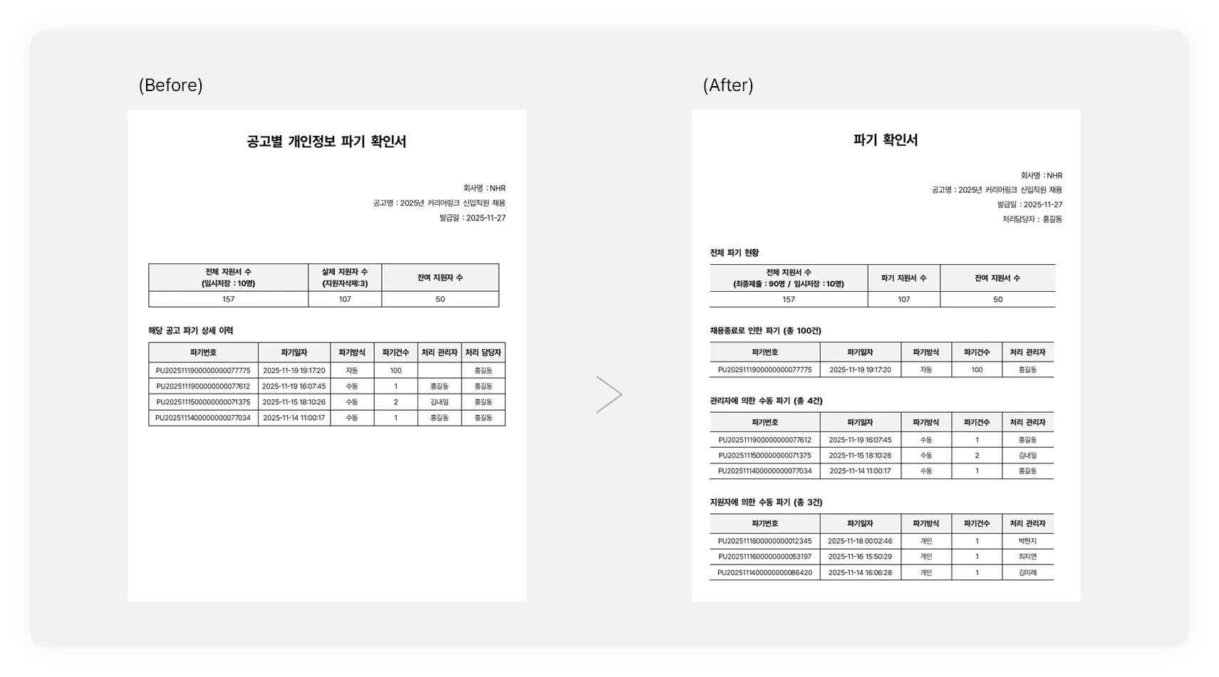 지원서의 삭제 주체(관리자/지원자)를 구분해 파기 확인서에 명확히 표시하도록 기능이 개선되었습니다. 지원자가 직접 자신의 지원서를 삭제한 경우에도 파기번호가 발급되어 관리자 페이지에서 바로 확인하실 수 있으며, 스스로 지원서를 삭제한 지원자의 이름 및 시간대도 확인할 수 있습니다.(탈퇴회원의 경우에는 이름이 표기되지 않습니다.) 이를 통해 담당자는 삭제 경로와 무관하게 모든 파기 이력을 한눈에 파악할 수 있습니다.