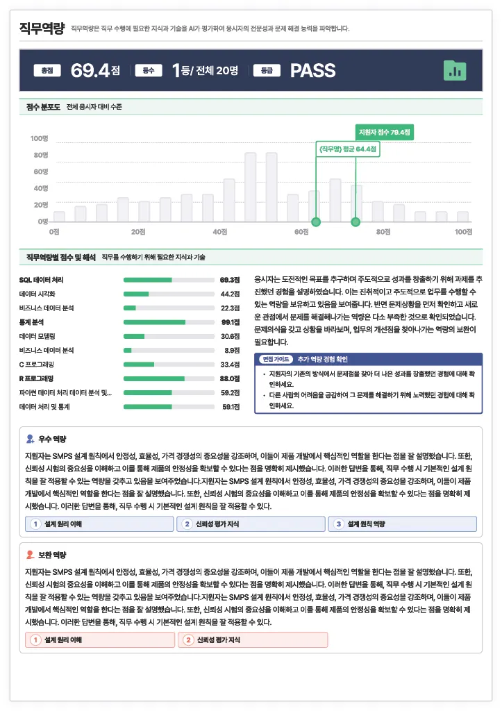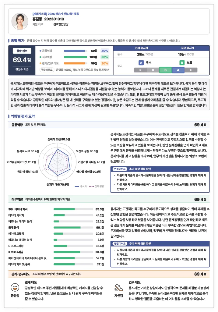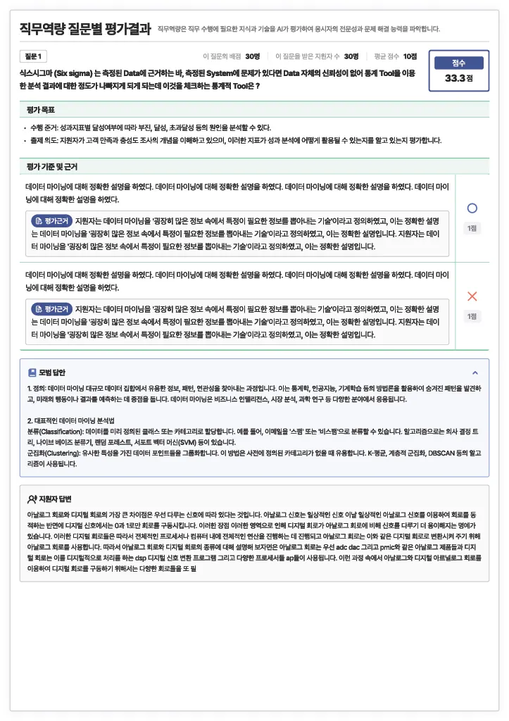 AI를 통해 자동으로 생성된 질문으로 채용에 체계적인 평가 기준과 질문을 적용하여 구조화된 면접 진행이 가능하며, 평가 및 결과 데이터로 평가의 신뢰성과 타당성을 확보할 수 있습니다.
