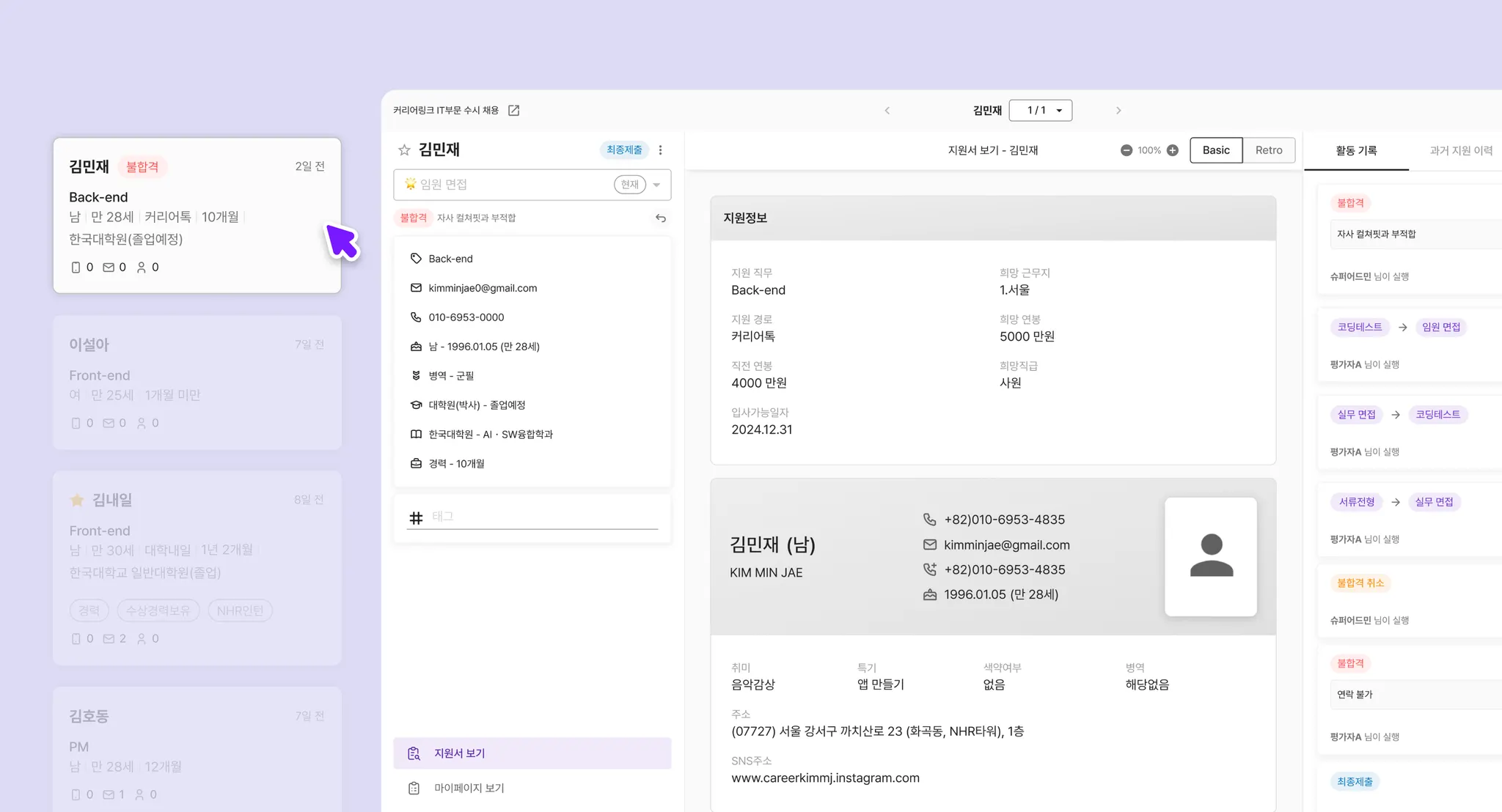 인적 정보, 평가 내역, 전형 이동 기록 등 지원자에 관한 모든 정보를 한 화면에서 간편하게 관리할 수 있습니다.