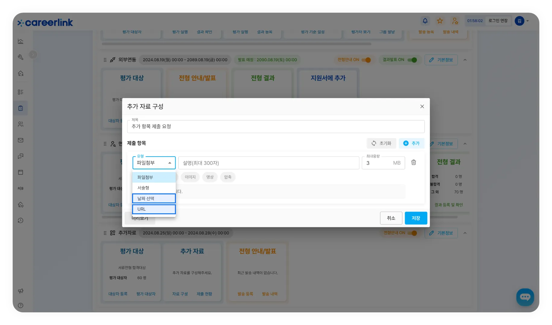 [채용 전형 관리] → [전형 관리] 내 ‘추가자료’ 전형에 대해 자료 구성 시, 제출 항목에 ‘날짜 선택’ 유형과 ‘URL’유형이 추가되었습니다.
