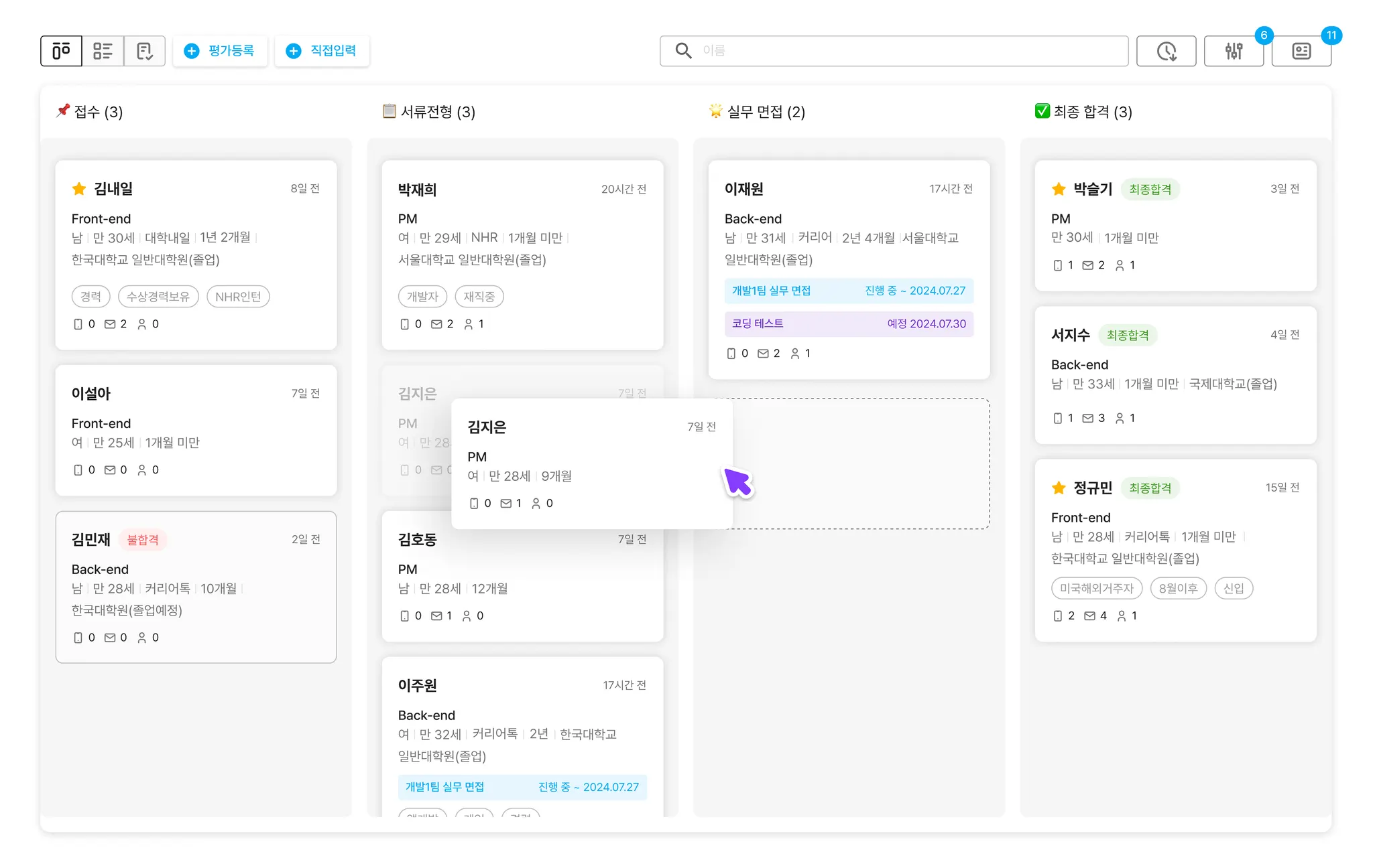 1. 지원자별 전형 운영 현황을 한눈에 확인할 수 있는 칸반보드