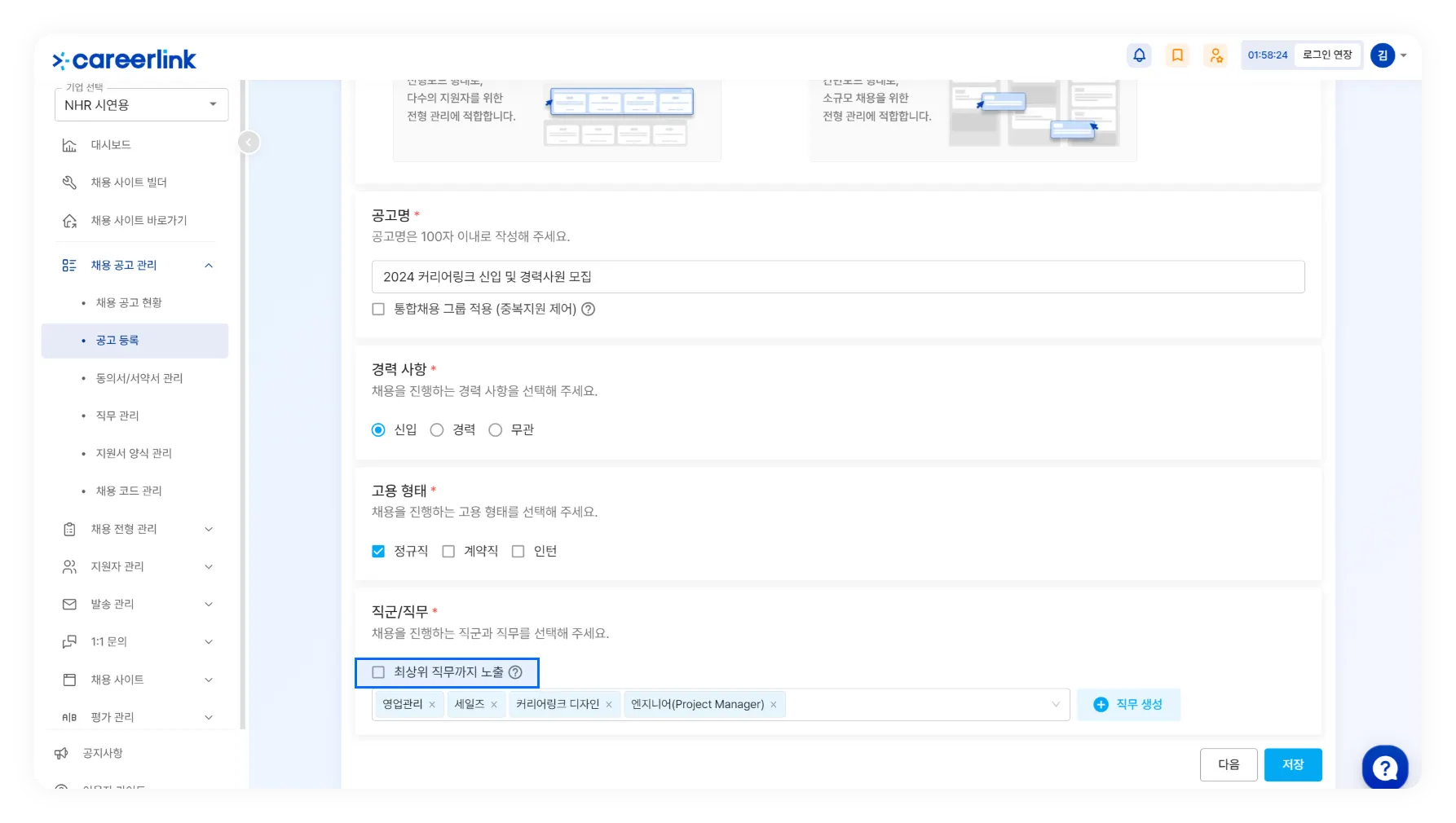 [채용 공고 관리] >[공고 등록]에서 채용 공고 등록 시, ‘최상위 직무까지 노출’ 체크박스 위치를 직군/직무 영역으로 이동하였습니다.