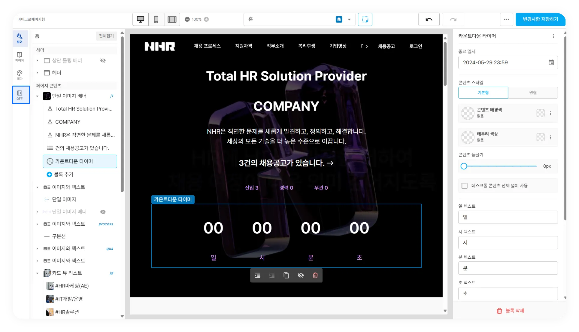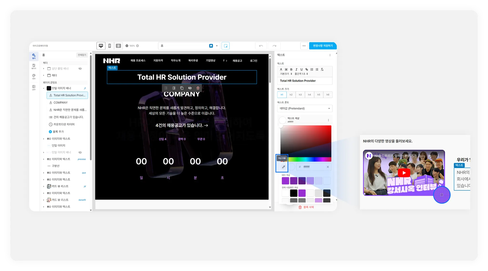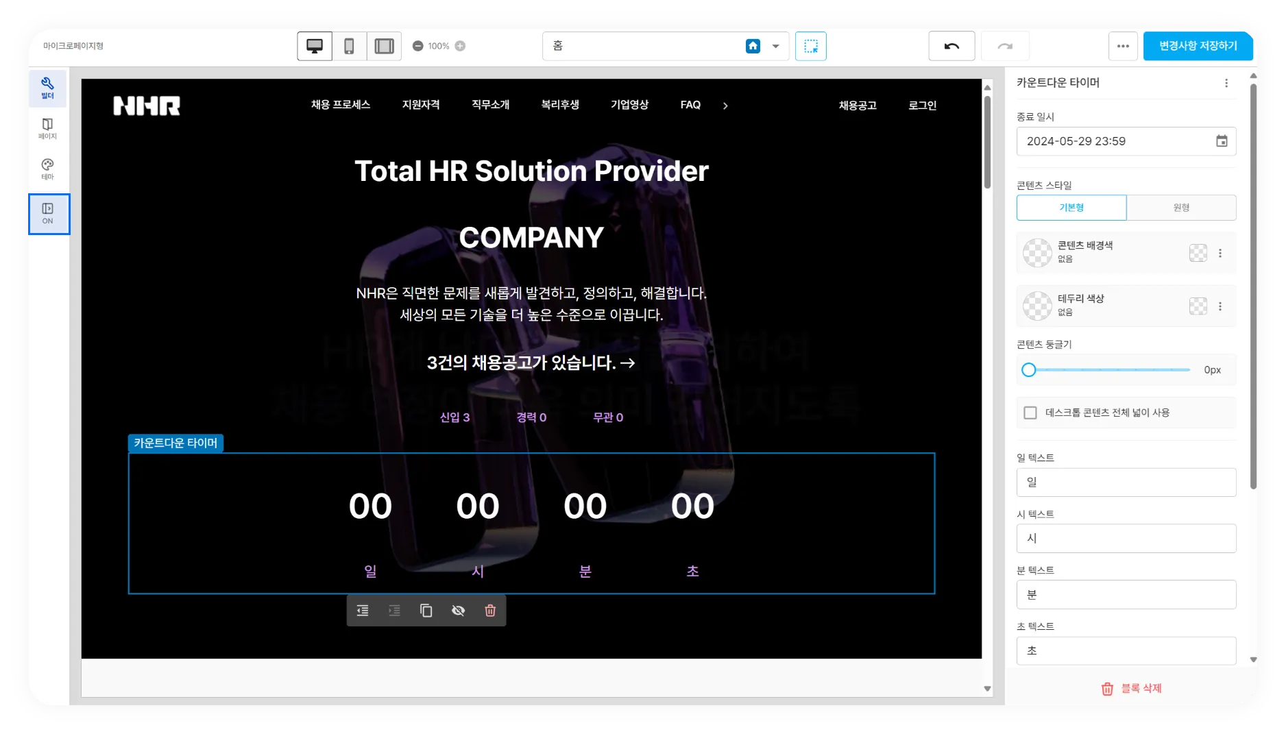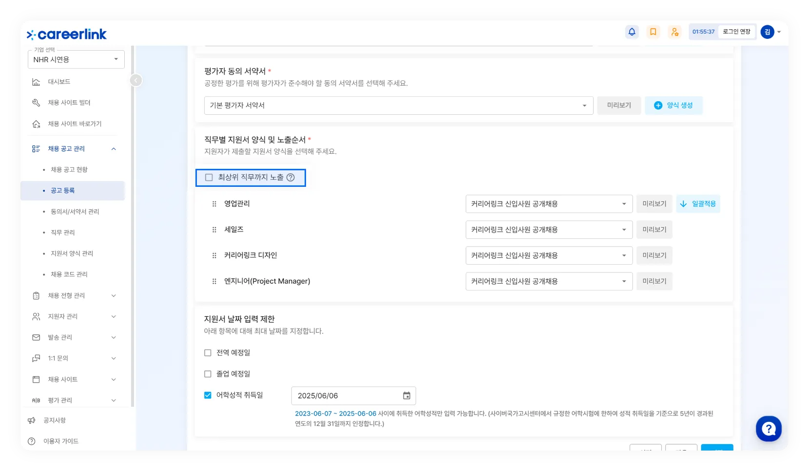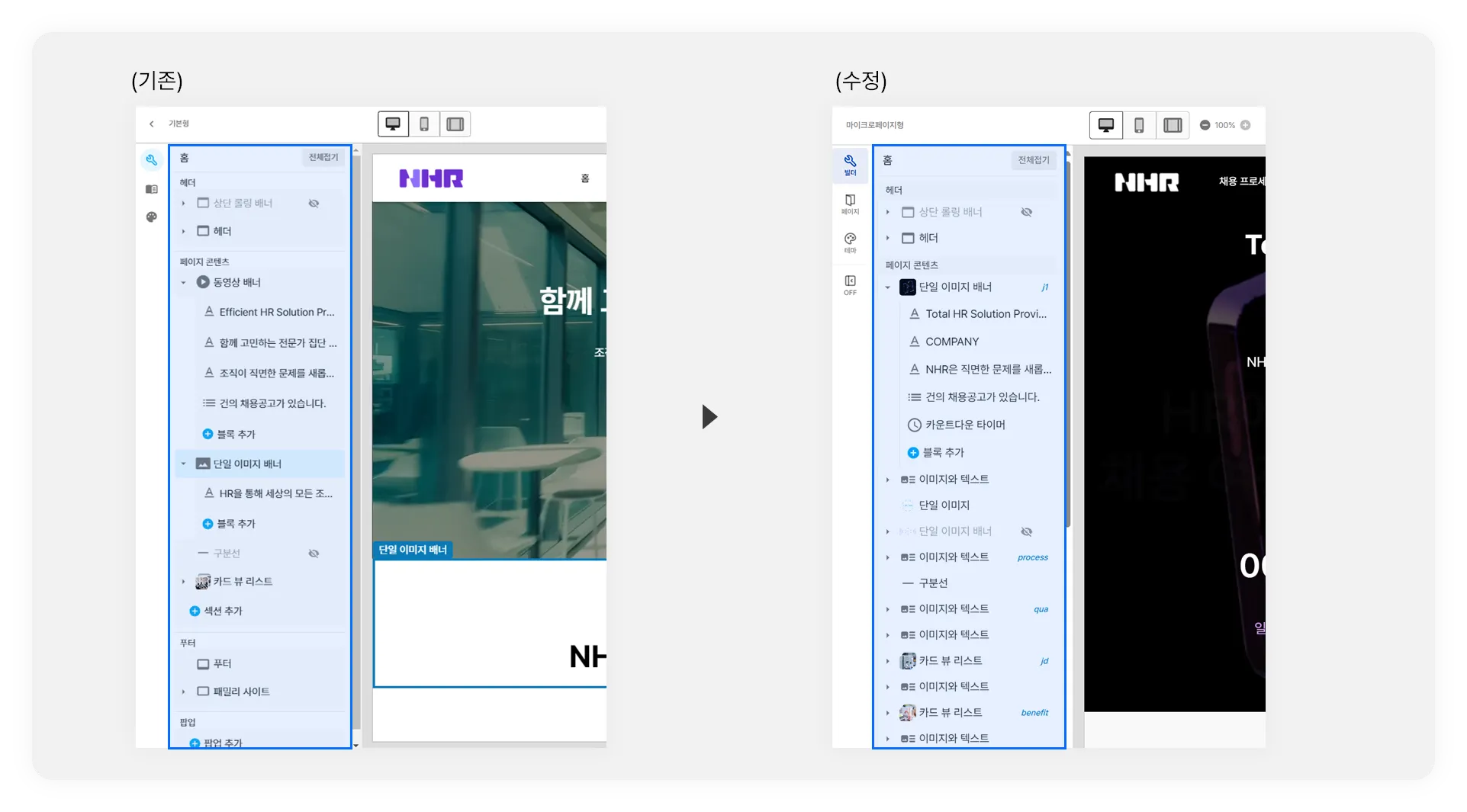 좌측 메뉴의 ON/OFF 기능이 추가되어 OFF를 클릭할 경우 조금 더 넓게 채용 사이트 빌더 사용이 가능합니다.