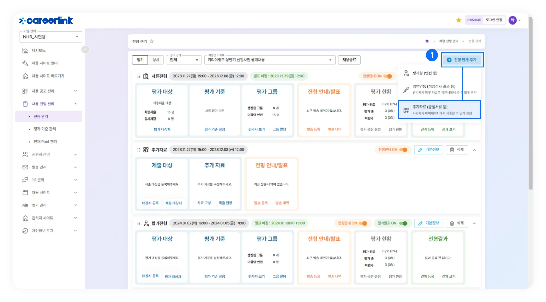 [채용 전형 관리] > [전형 관리]에서 공고 클릭 후, [+전형단계 추가] > [추가자료(증빙서류 등)]을 클릭합니다.