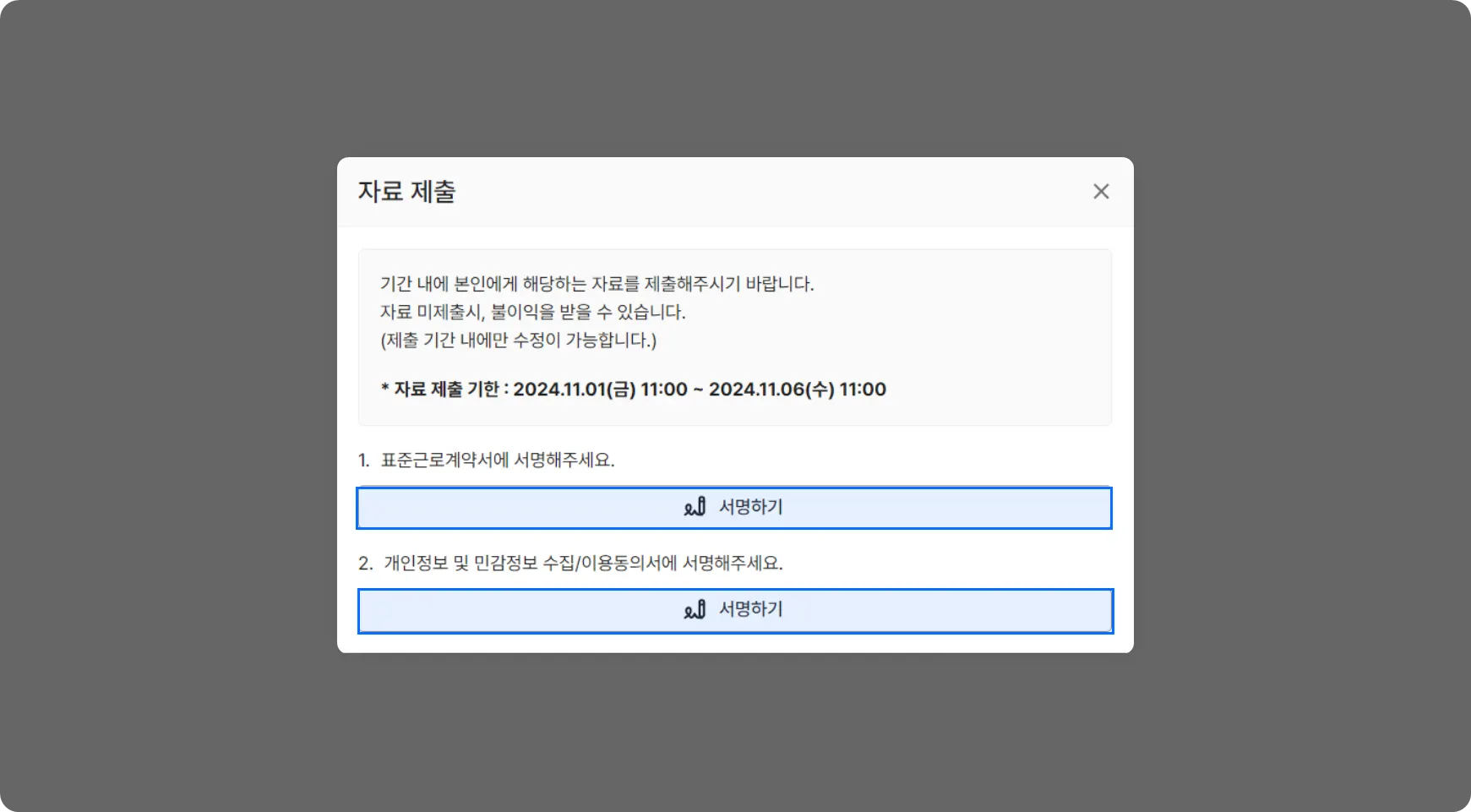 마이페이지를 통해 지원자에게 서명 작성을 요청할 수 있습니다.