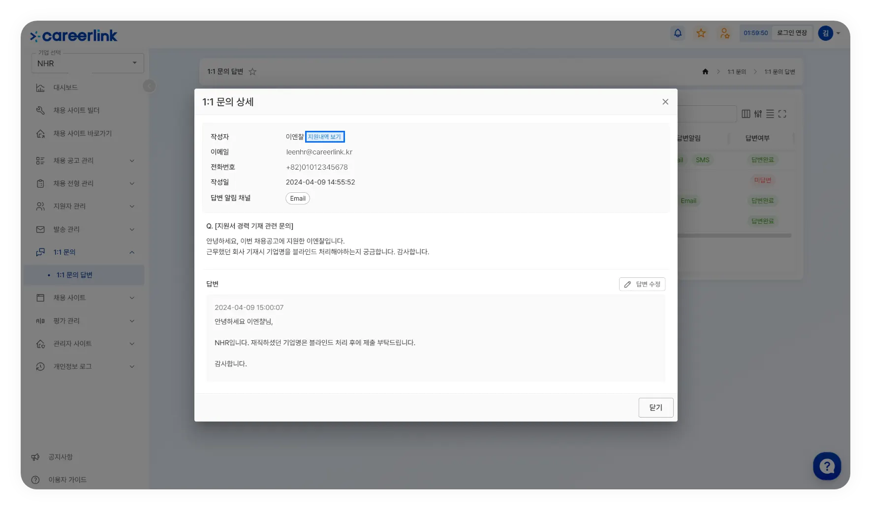 [1:1 문의] > 1:1 문의 답변에 문의 내용 등록 시, 지원자의 과거 지원 내역을 확인하실 수 있습니다.