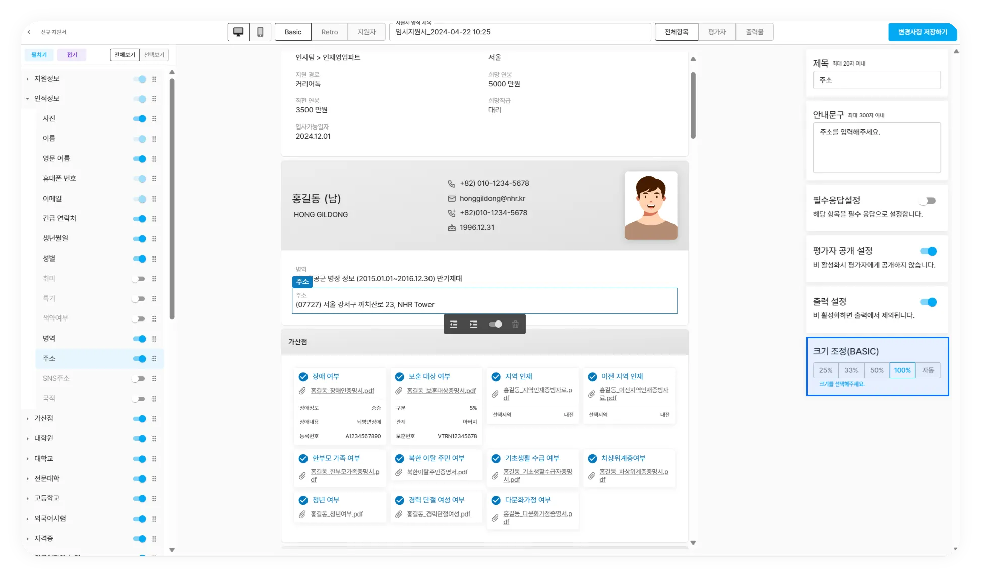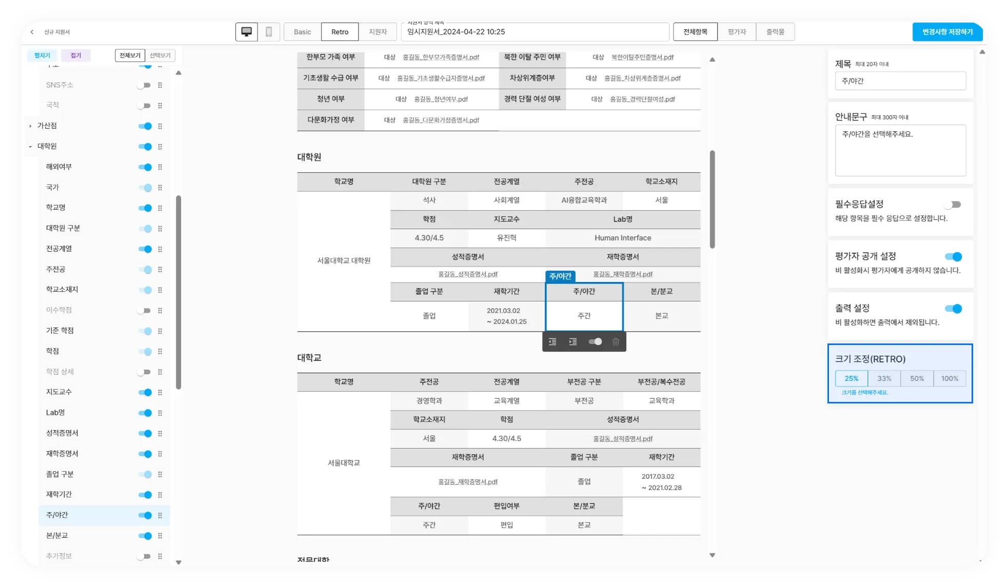 지원서 내의 항목 사이즈를 조절 할 수 있는 그리드 기능이 추가되어 지원서 항목의 너비를 원하시는 사이즈대로(25%, 33%, 50%, 100%) 조절하여 설정 할 수 있습니다.(Basic모드 / Retro모드 각각 별개로 크기 조정이 가능합니다.)