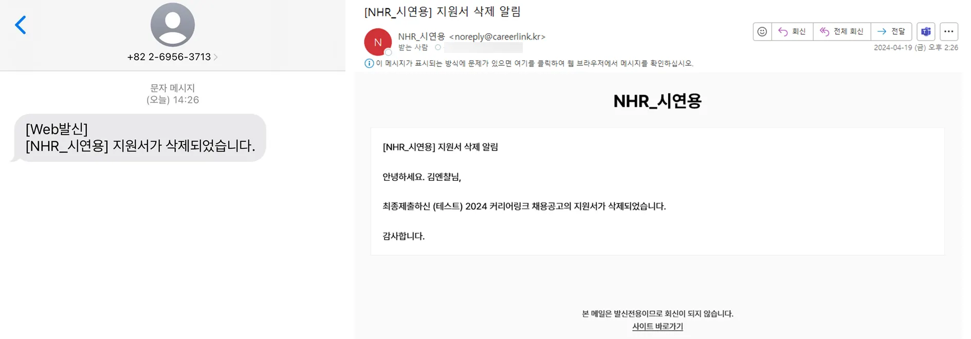 지원자는 아래와 같은 SMS / Email을 수신하게 됩니다.