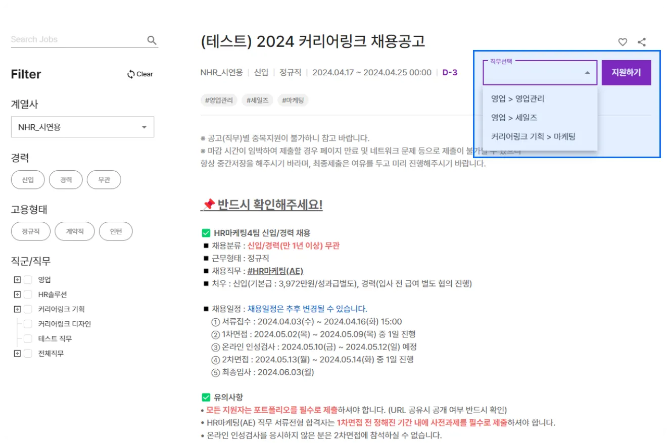 또한 ‘최상위 직무까지 전체 노출 사용’을 클릭할 경우, 최상위 직무까지 ‘채용 사이트’ → ‘채용공고’ → ‘지원하기’ → ‘직무 선택’ 화면에 보여집니다.