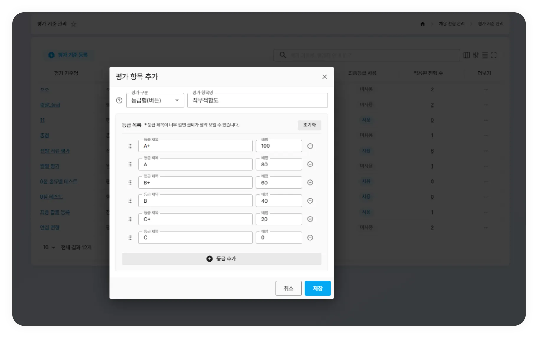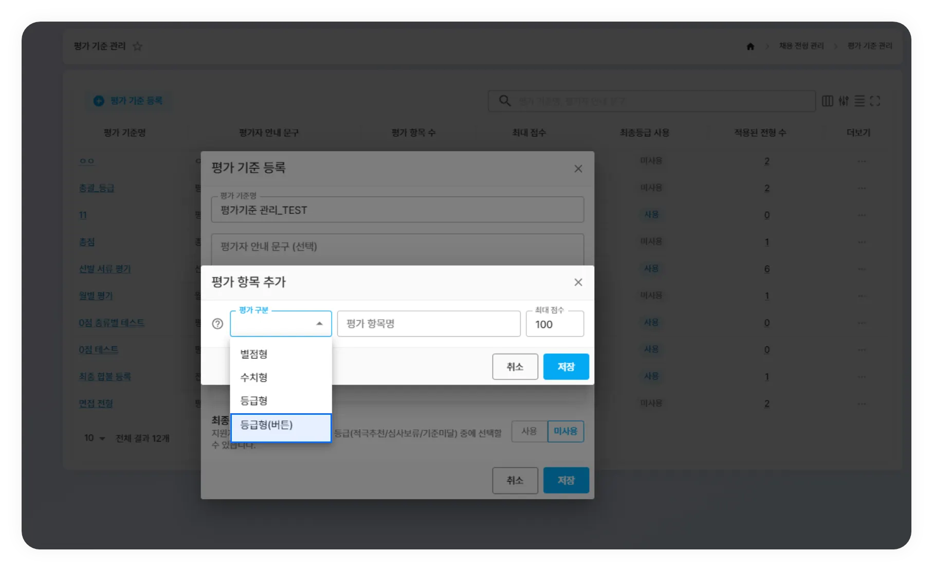 평가 기준 항목 구분 내 등급형(버튼) 추가 기능